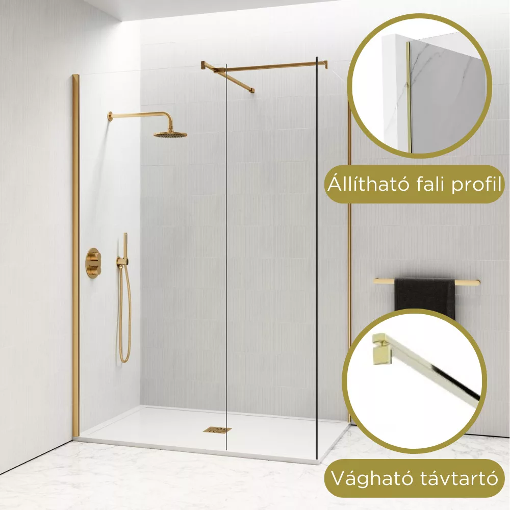 A mai modern stílusnak megfelelően alkottuk meg a visszafogott, mégis szemet gyönyörködtető Walk-In zuhanyfalunkat. Helyet kaphat bármilyen stílusú fürdőszobában, képes a belső összképhez hozzájárulni. A arany színű profilok és távtartó remek színárnyalatban készülnek el, ami a különböző megvilágítások alatt is kellemes érzetet keltenek.