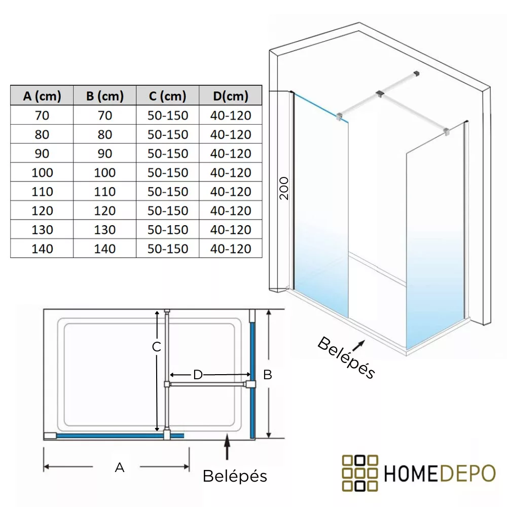 A távtartó 50-150, illetve 40-120 cm között szabadon vágható, így az igényeknek megfelelően lehet beállítani a zuhanyfalak távolságát a faltól és egymástól.