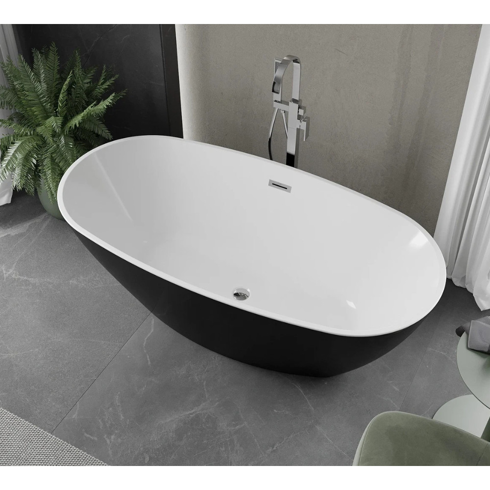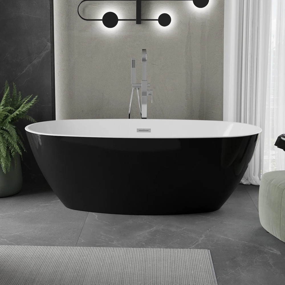 Ovális formájú térben álló fényes fekete külső és hófehér belsővel rendelkező akril kád tükörsima felülettel, amely egy kiváló minőségű és egyedi stílusú fürdőszobai luxus termék fényes króm túlfolyóval és click-clack leeresztővel.