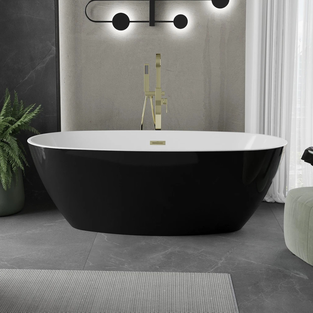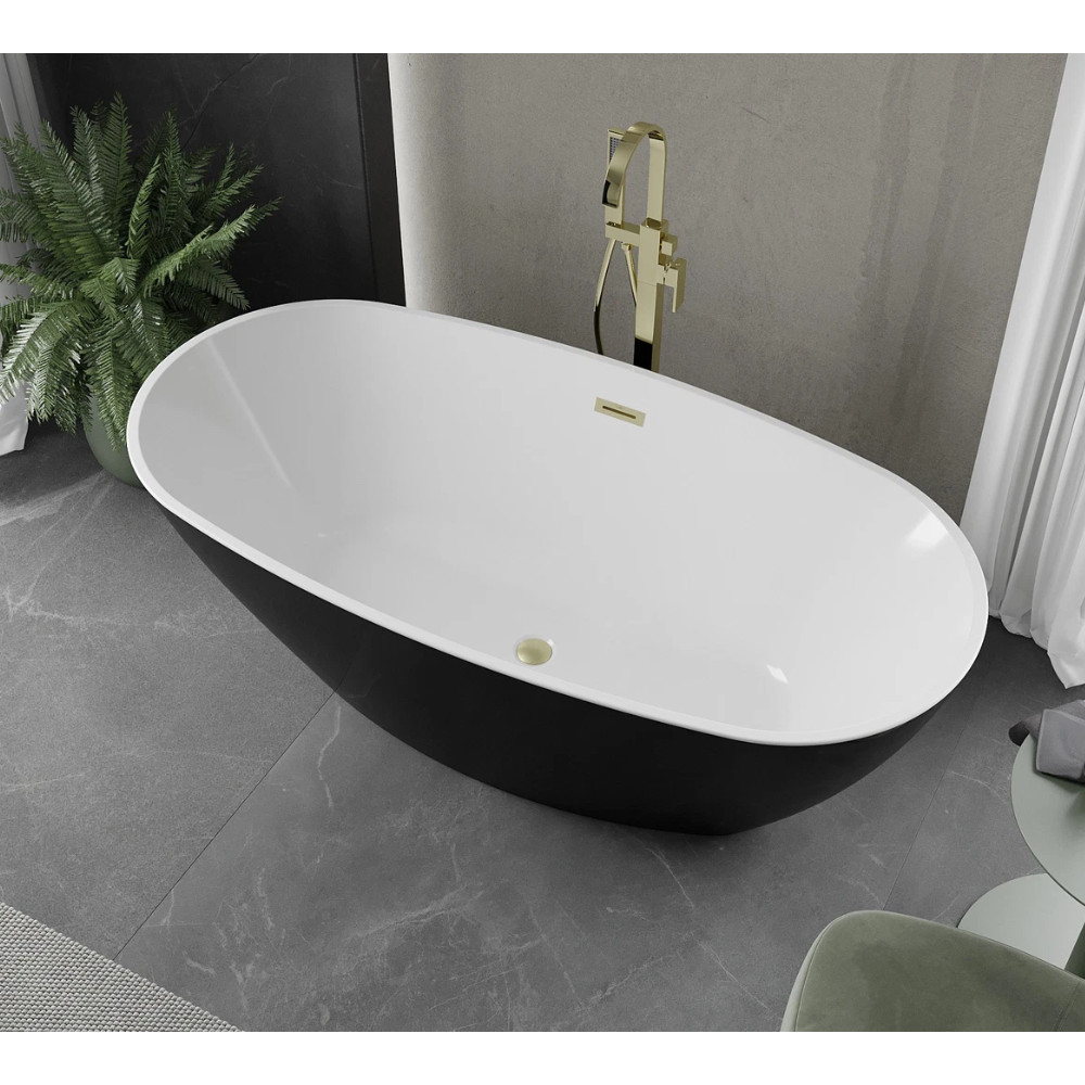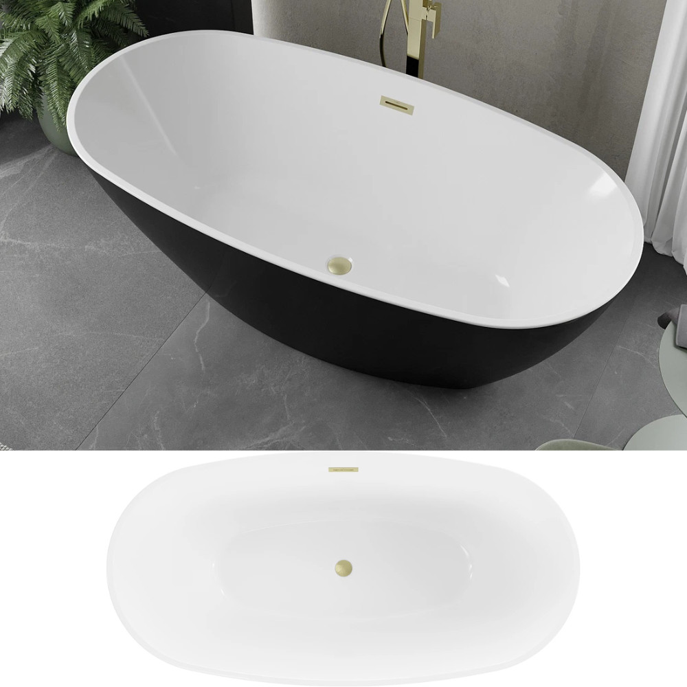 Aurora Black&White ovális térben álló akril kád, 170 cm hosszú, szálcsiszolt arany elemekkel Saját márkás termékeink kialakítása során figyelembe vettük az emlúlt évek fogasztói igényeit, ezek alapján alkottuk meg a magas elvárásoknak megfelelő térben álló kádunkat.