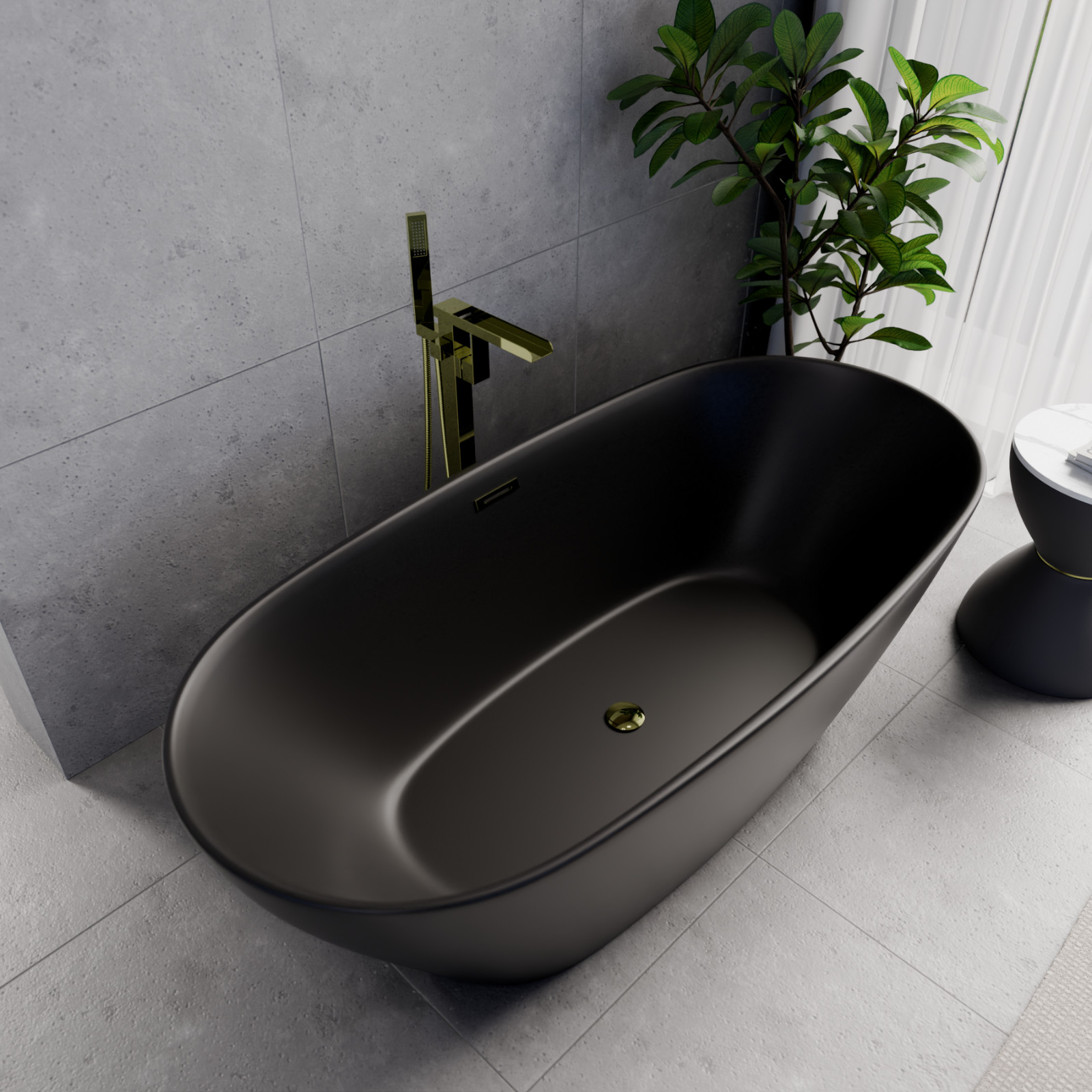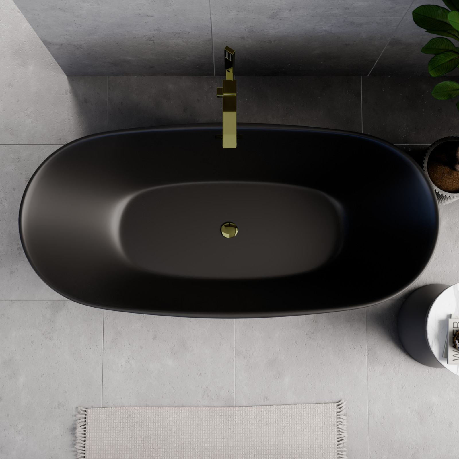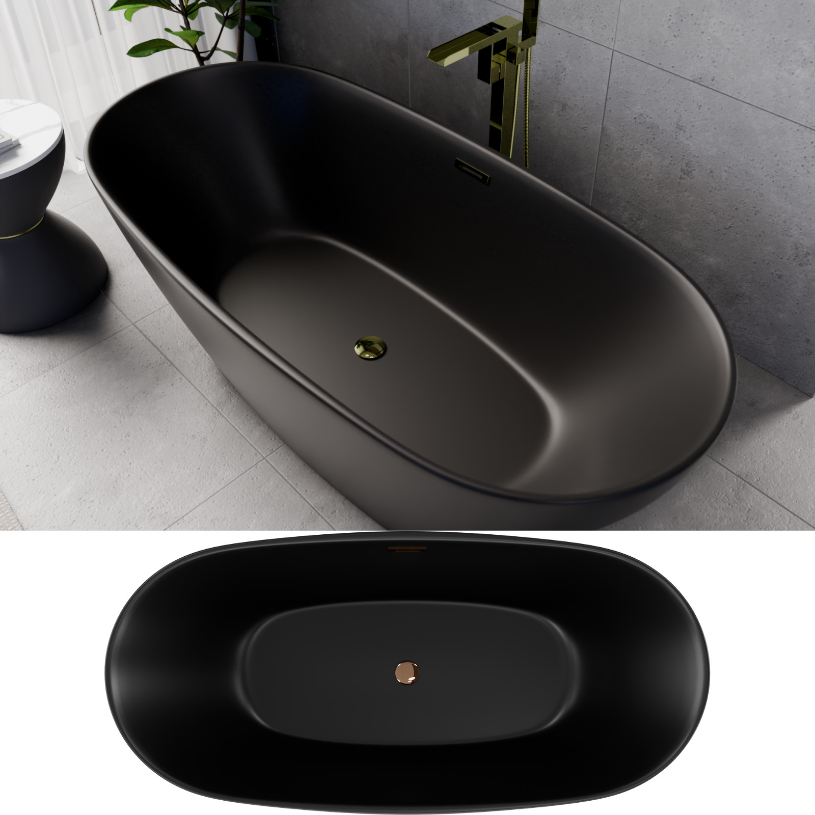 HD Aurora Matt Black 170x75 ovális térben álló akril kád fényes arany túlfolyóval és click-clack leeresztővel