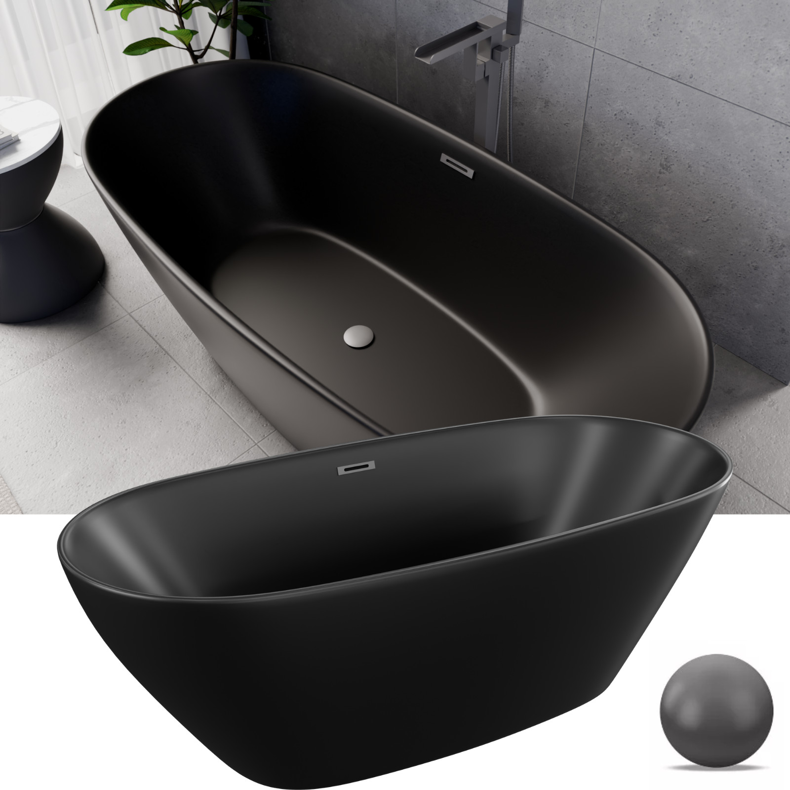 HD Aurora Matt Black 170x75 ovális térben álló akril kád szürke túlfolyóval és click-clack leeresztővel