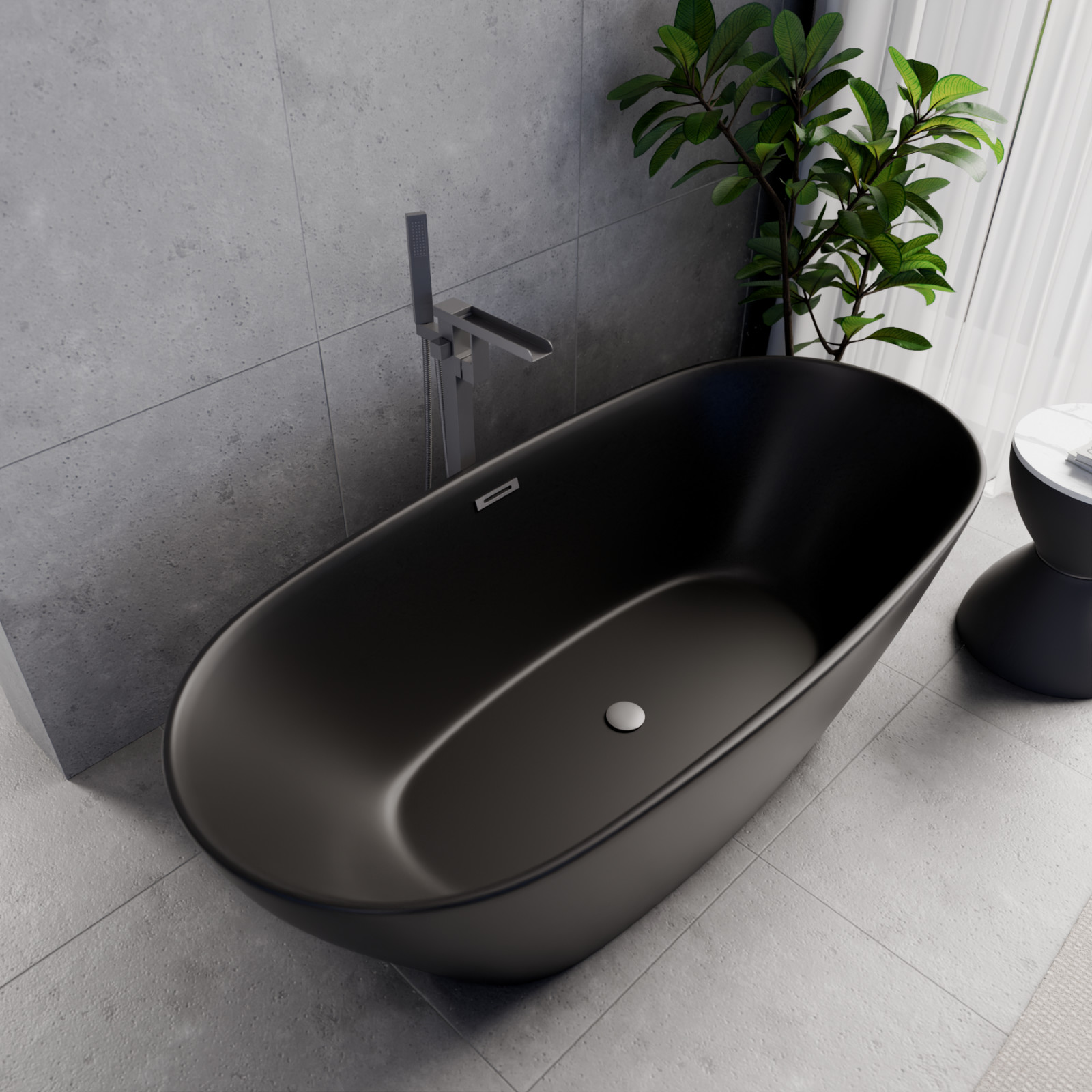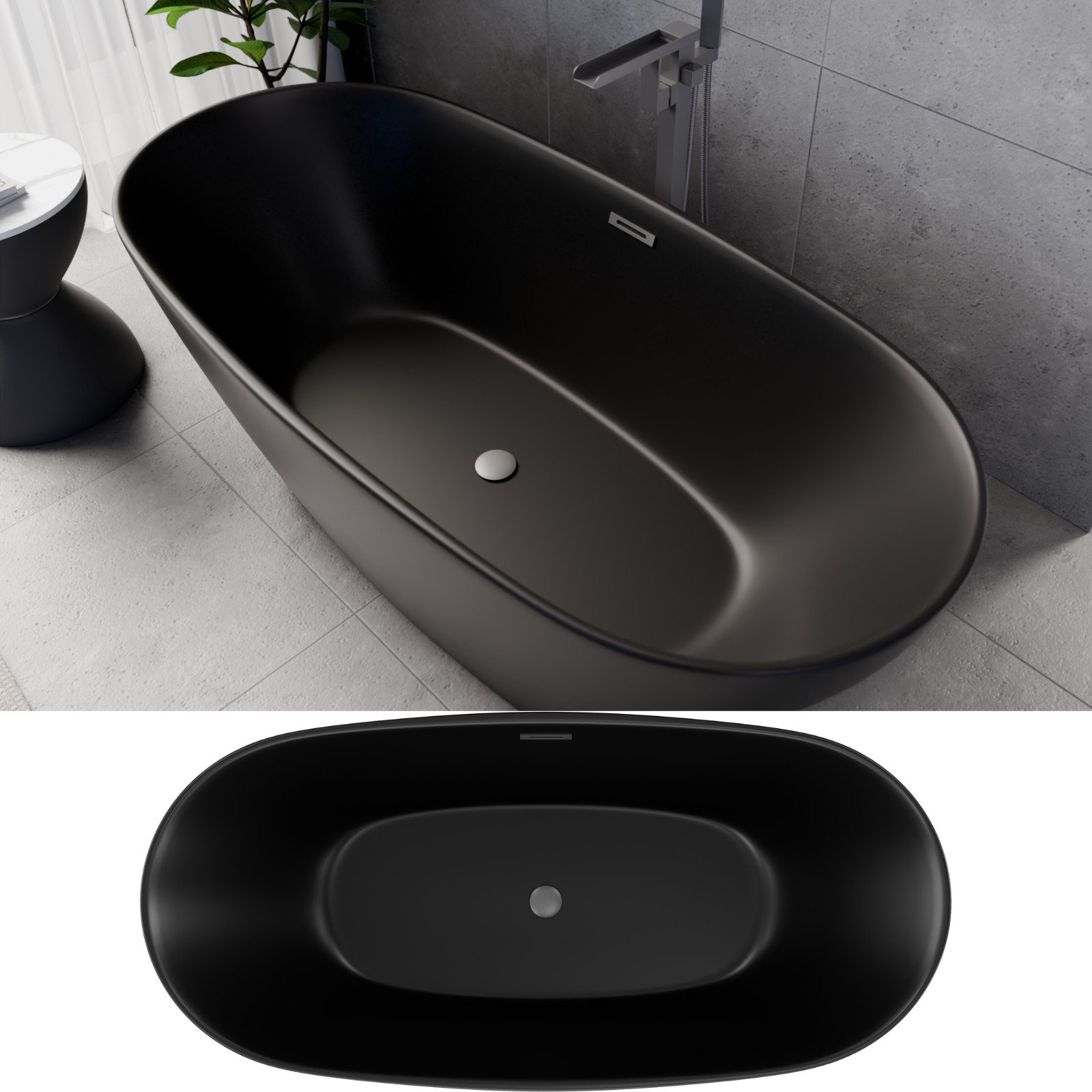Aurora Matt Black ovális térben álló akril kád, 170 cm hosszú, szürke elemekkel