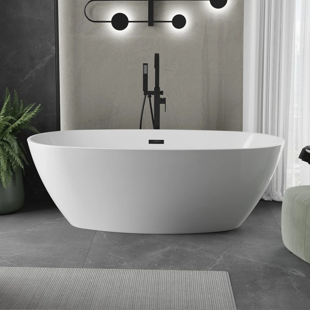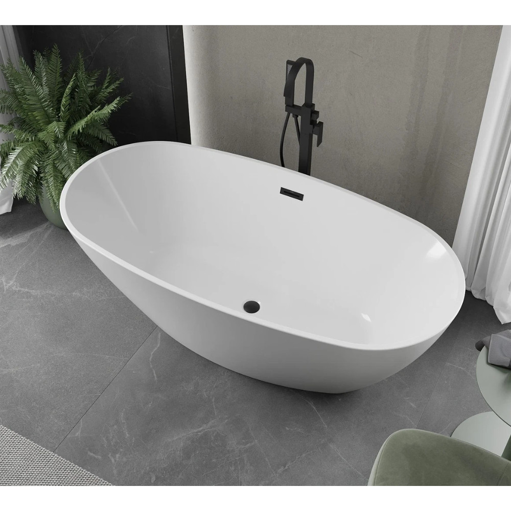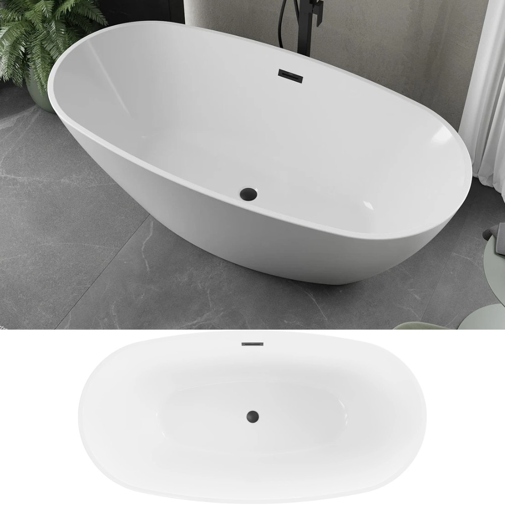 Ovális formájú térben álló hófehér akril kád tükörsima felülettel, amely egy kiváló minőségű és egyedi stílusú fürdőszobai luxus termék matt fekete túlfolyóval és click-clack leeresztővel.
