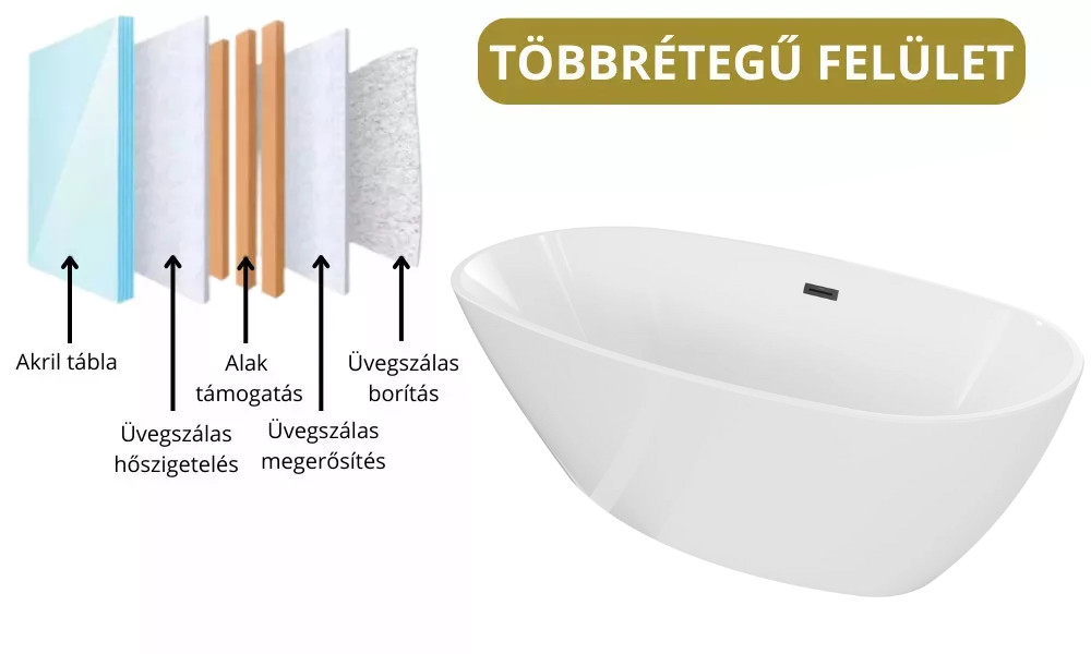A fürdőkád műgyanta-üvegszálas erősítéssel készítik gyártáskor, aminek köszönhetően rendkívüli hőszigetelő képességgel rendelkezik. Ennek nagy előnye, hogy nem hűti el a vizet a kád felülete, így garantáljuk a hosszan tartó fürdőzést.
