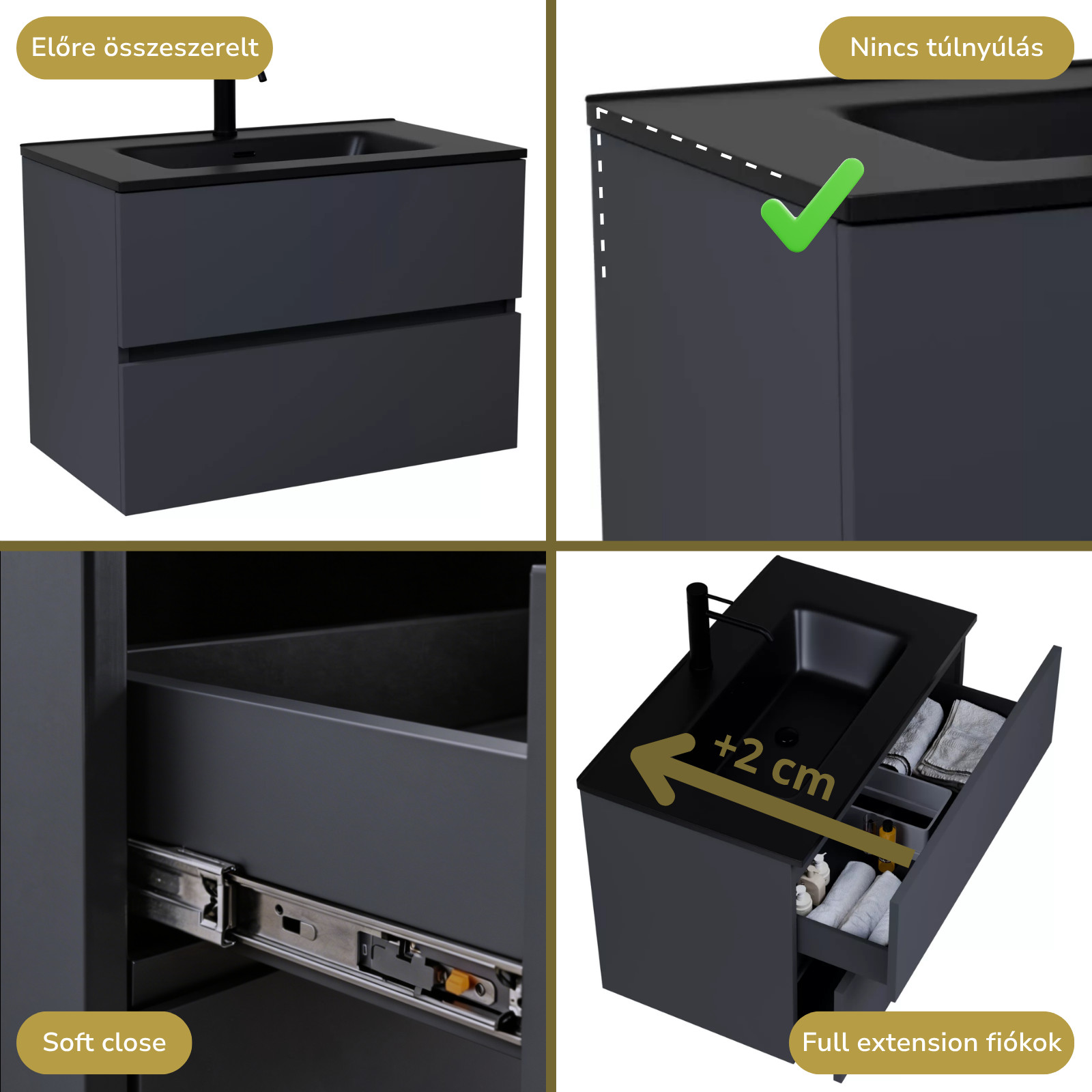 • antracit mosdószekrény, teljes kihúzhatóságú fiókokkal