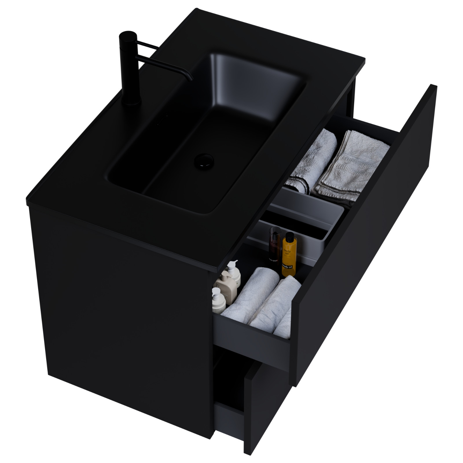 fekete mosdószekrény, teljes kihúzhatóságú fiókokkal