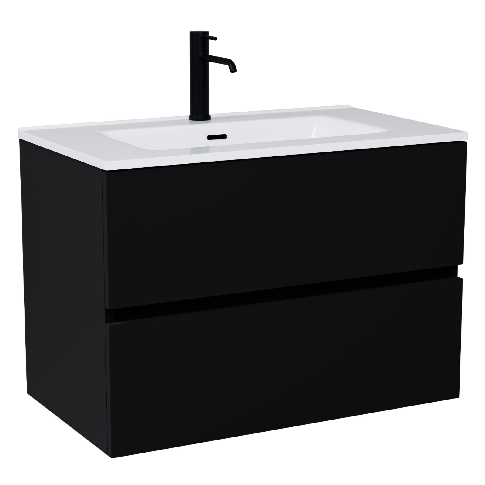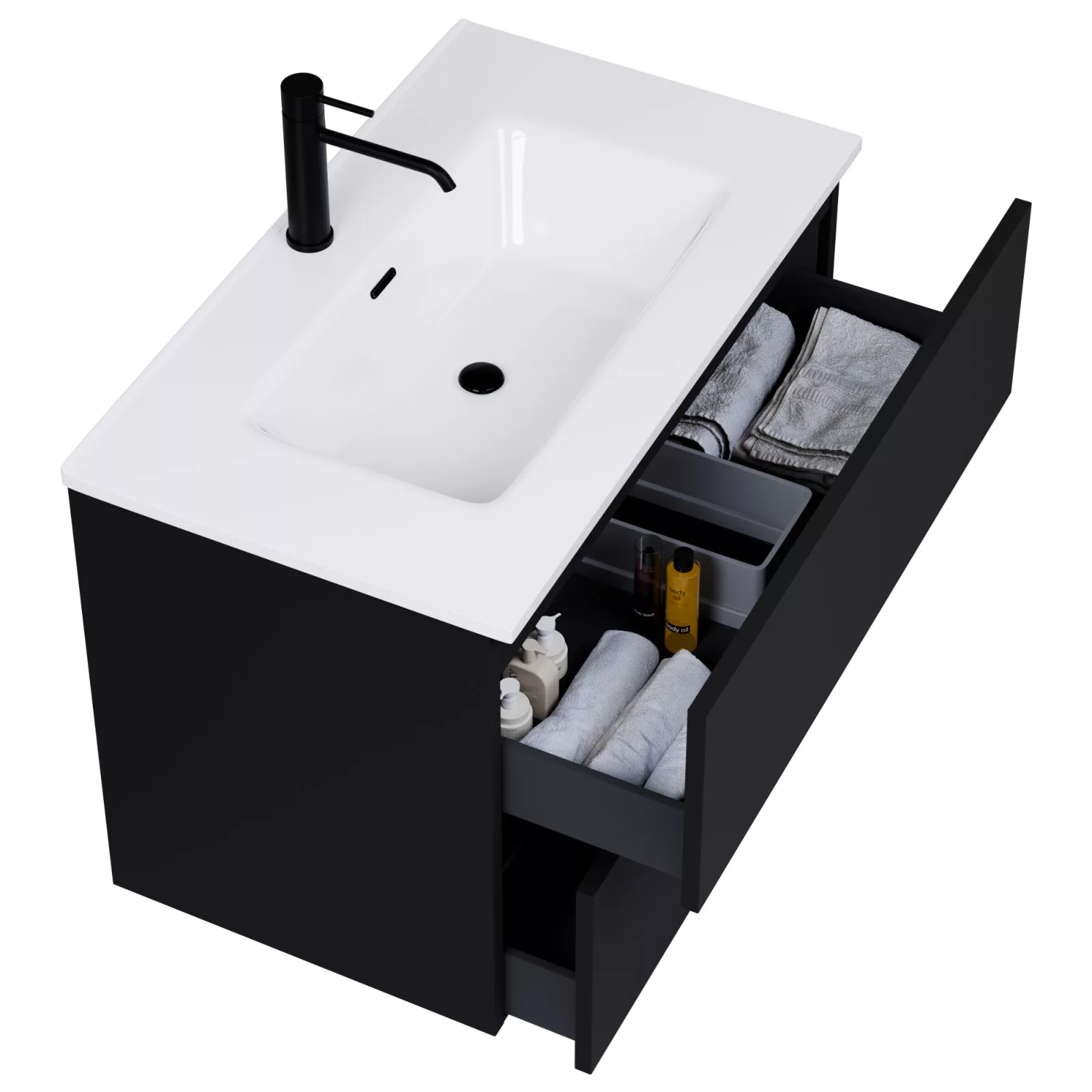 • fekete mosdószekrény, teljes kihúzhatóságú fiókokkal