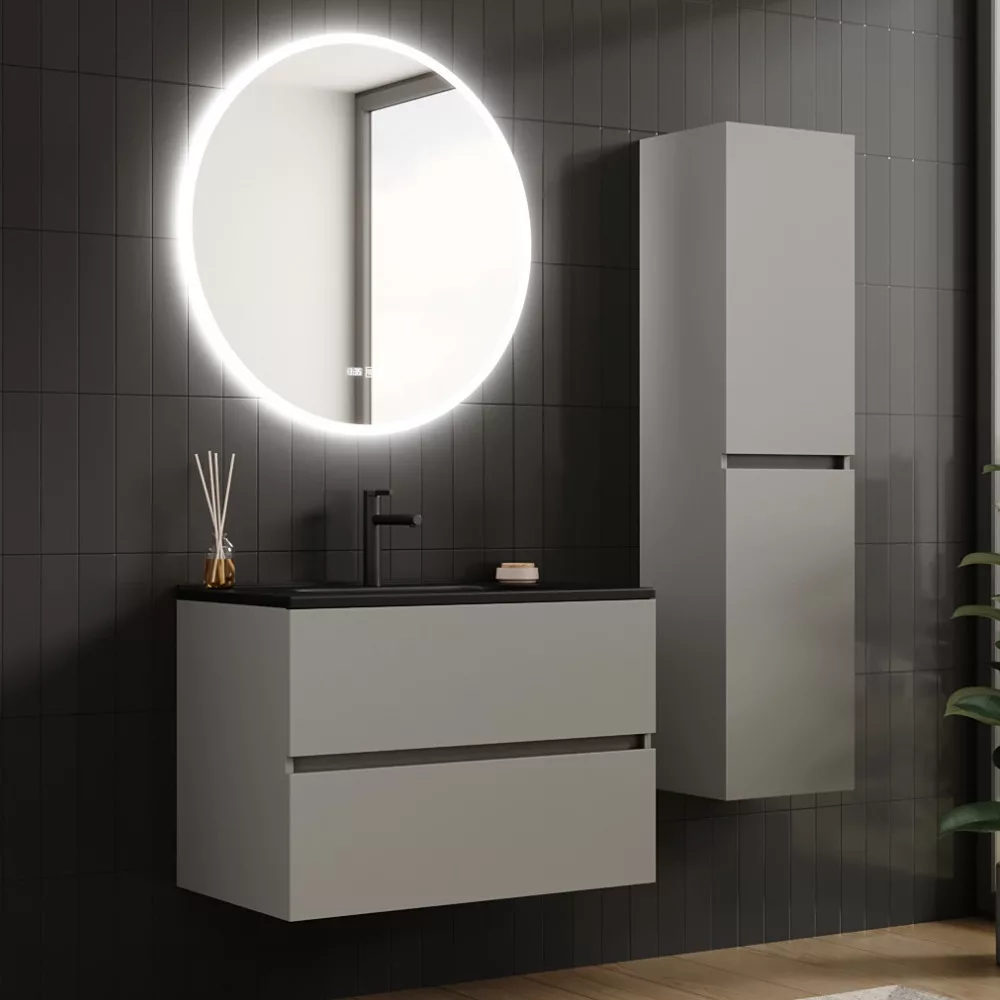 Saját márkás 80 cm széles komplett fürdőszoba bútor fali mosdószekrénnyel füst szürke színben, fekete slim mosdóval és fali okos LED tükörrel.