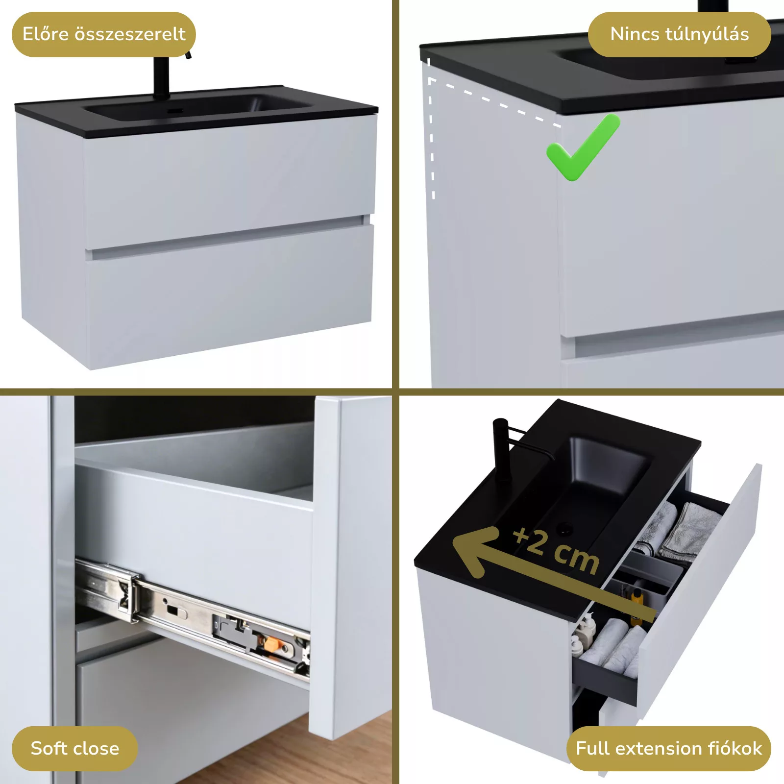 A bútort összeszerelve szállítjuk ki, így Önnek csak a mosdót és a fiók frontot kell ráhelyeznie!
