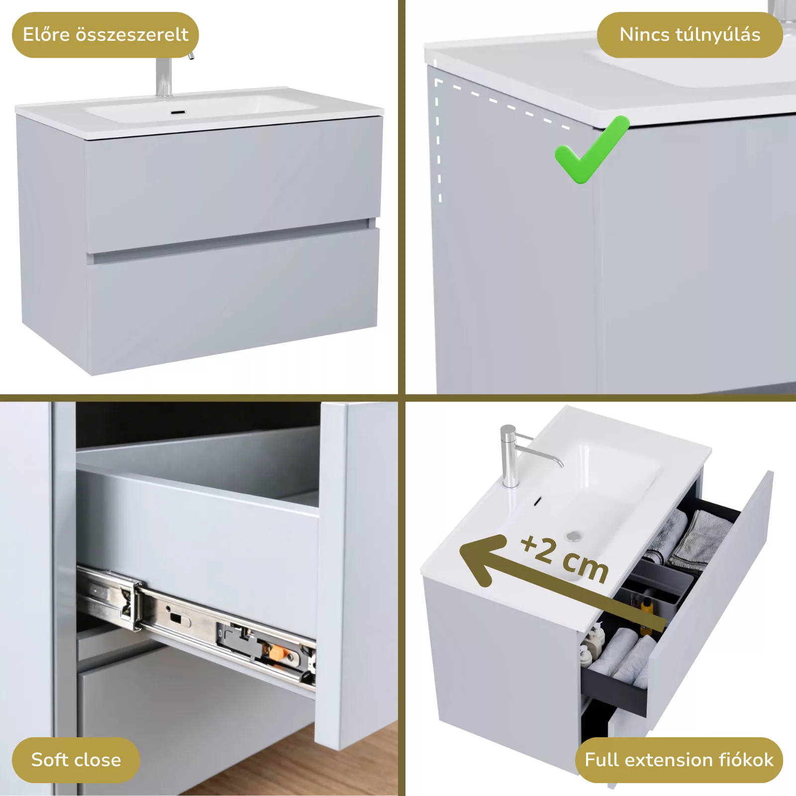 A bútor előre összerelt állapotban szállítjuk, így Önnek nincs más teendője már vele, csak fel kell rögzíteni a falra és fehelyezni a mosdót, illetve a fiók frontot.