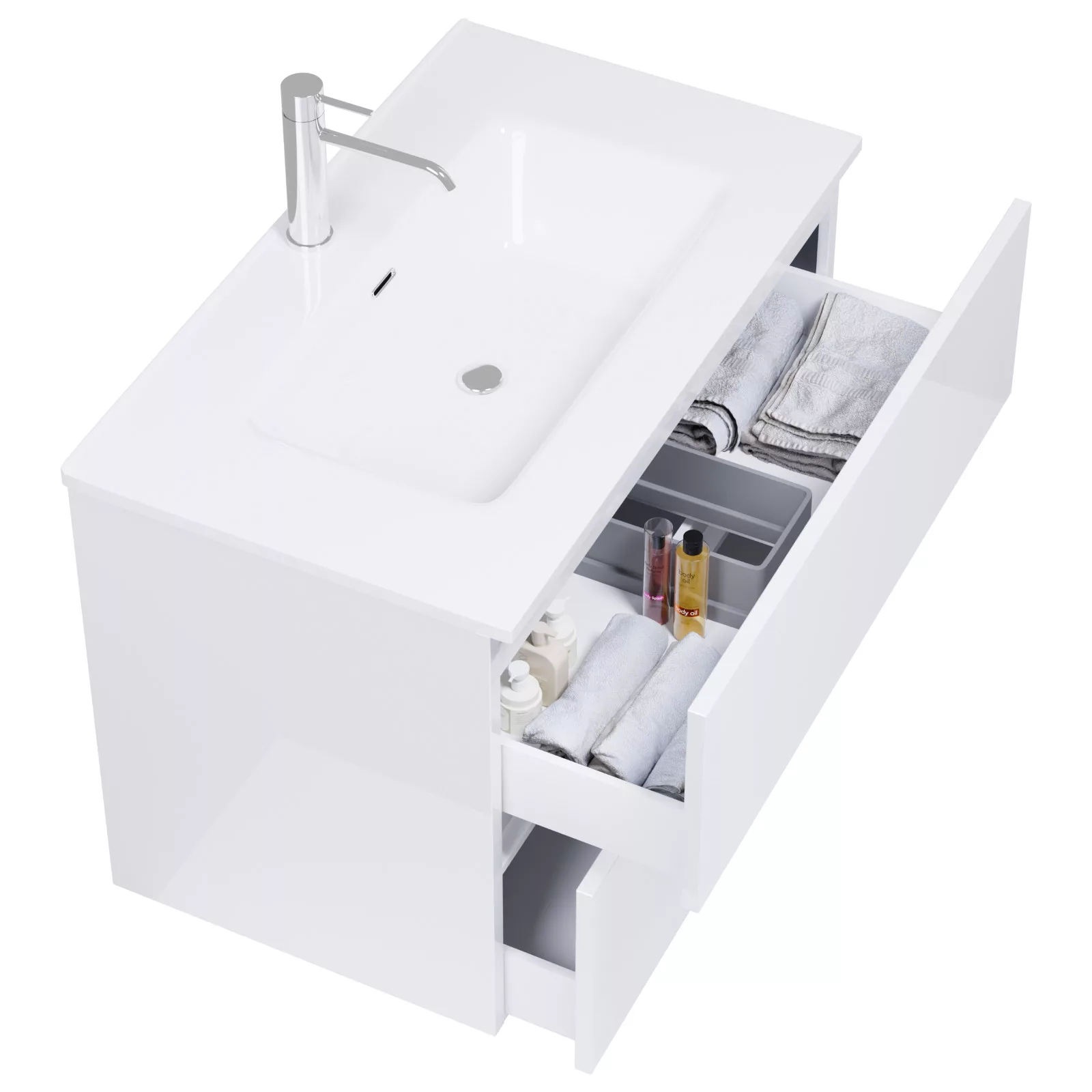 fényes fehér mosdószekrény, teljes kihúzhatóságú fiókokkal
