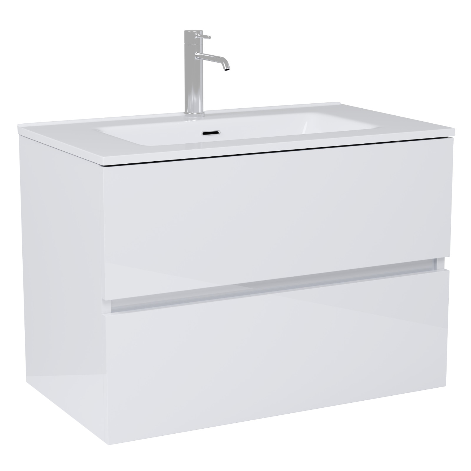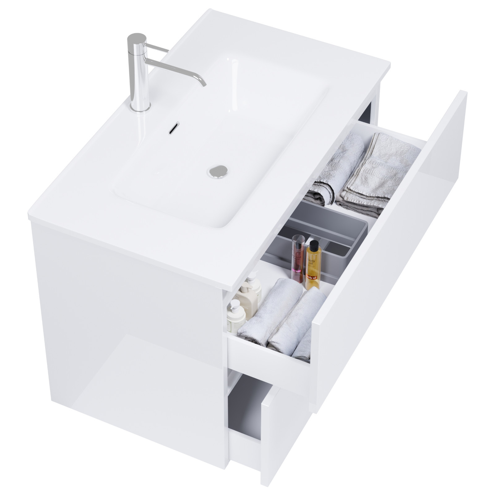 • fényes fehér mosdószekrény, teljes kihúzhatóságú fiókokkal
