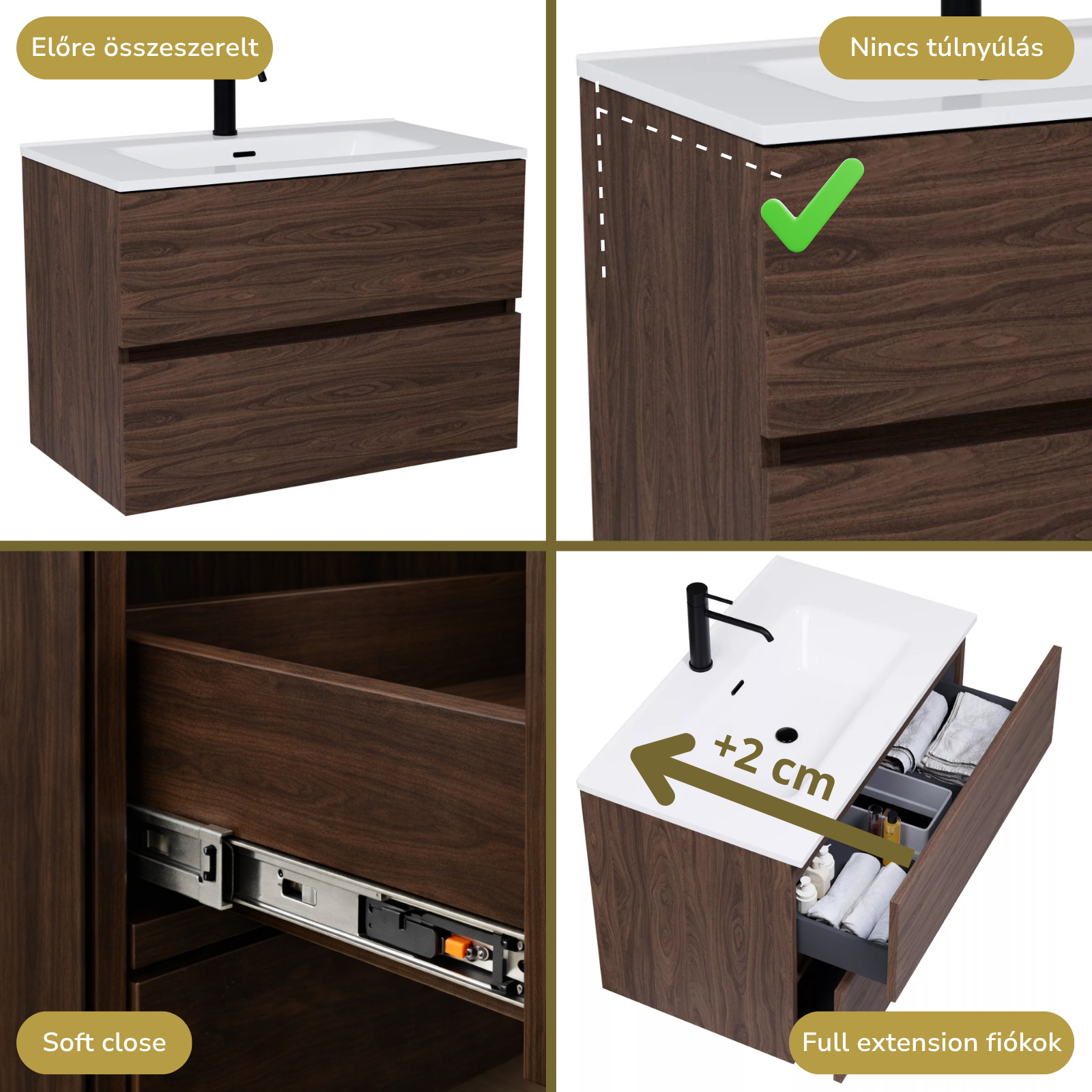 • mogyoró színű mosdószekrény, teljes kihúzhatóságú fiókokkal