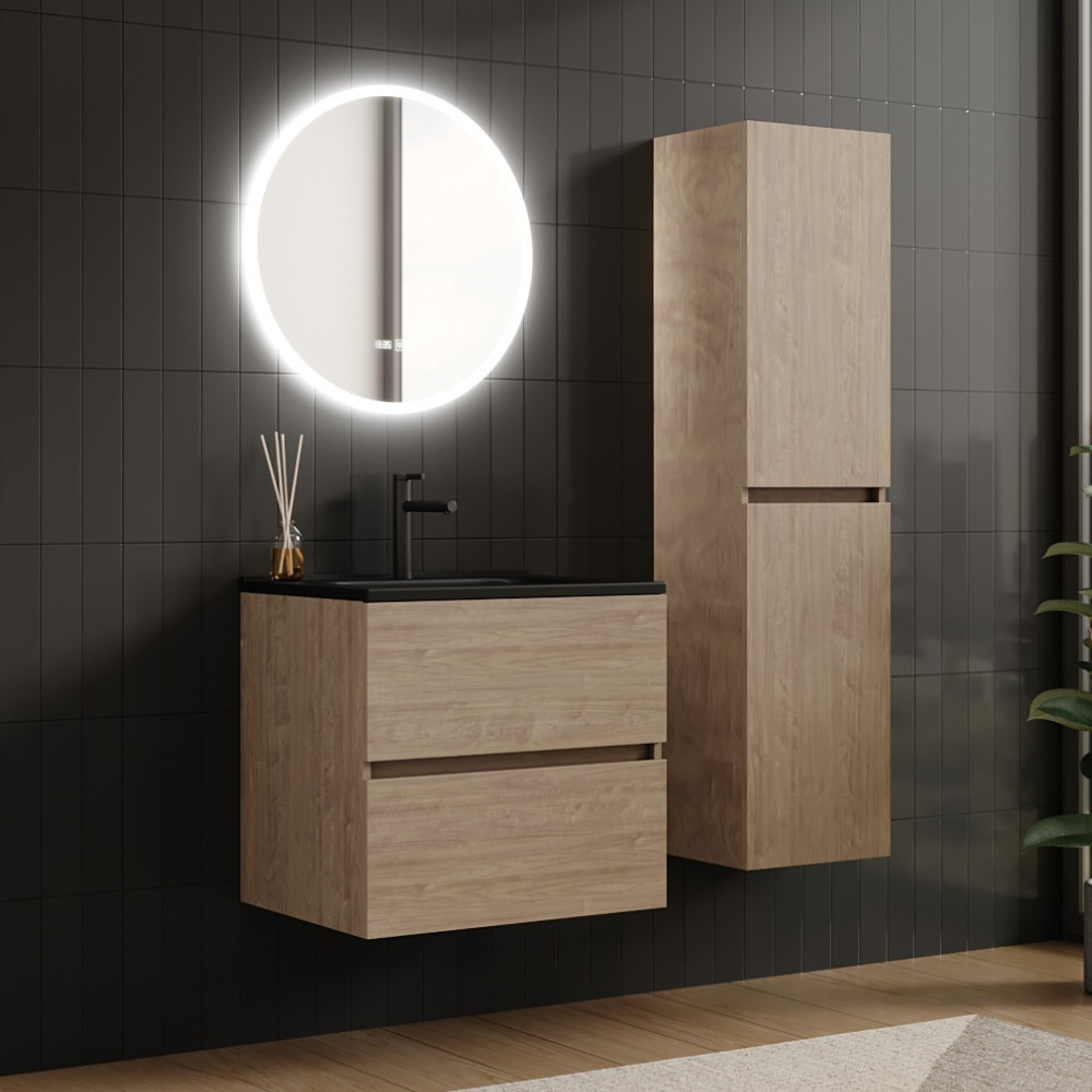 Saját márkás 60 cm széles komplett fürdőszoba bútor fali mosdószekrénnyel tölgyfa színben, fekete slim mosdóval és fali okos LED tükörrel.