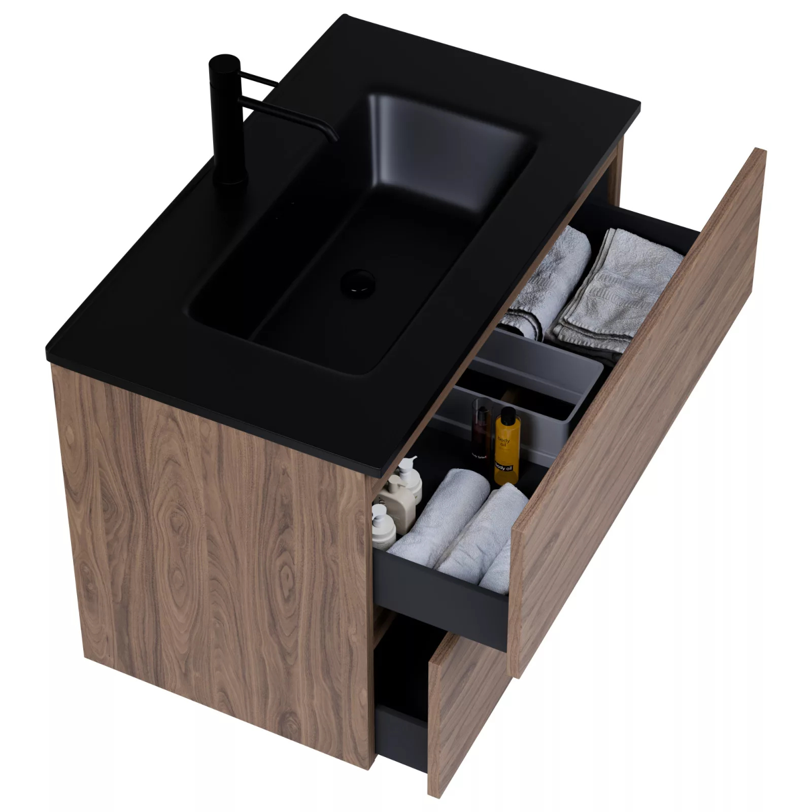 Napjainkban a praktikum mellett a fürdőszoba esztétikus megjelenése is fontos szempont. A függesztett bútorok egyre elterjedtebbé válnak, mivel számos előnnyel rendelkeznek, ide sorolható a modern, könnyed megjelenés és az egyszerű tisztítás. A függesztett fürdőszobai bútorok a klasszikus és modernebb stílusú fürdőszobákban is megállják a helyüket egyaránt. Nagyfokú rugalmasság jellemzi őket, mivel szinte bárhol elhelyezhetők a fürdőszobán belül. További előnyük, hogy soft close (csillapítós) zsanérral felszereltek, így  becsukáskor az ajtó vagy fiók finoman záródik be, csökkentve a terhelést és növelve az élettartamot. A szekrény fehér és matt fekete mosdóval, illetve mosdópulttal is szabadon kombinálható ízlés szerint. A teljesség érdekében a mosdószekrényekhez illő LED okostükröt és magas szekrényt is választhatunk, hogy a fürdőszobában lévő bútorok egy szemet gyönyörködtető egységet alkossanak.