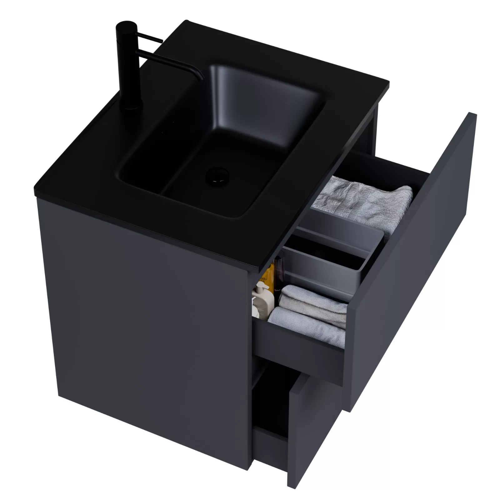 Saját márkás 60 cm széles komplett fürdőszoba bútor fali mosdószekrénnyel antracit színben, fekete slim mosdóval és fali okos LED tükörrel. A fiókok modern push-to-open mechanizmussal nyílnak, amely mechanikus rugós rendszerrel biztosítja a fogantyú nélküli nyitást.