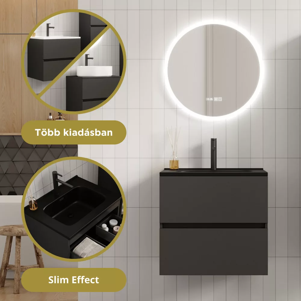 HD Aria Pro Antracit 60 komplett fürdőszoba bútor fali push-to-open mosdószekrénnyel, matt fekete slim mosdóval és tükörrel