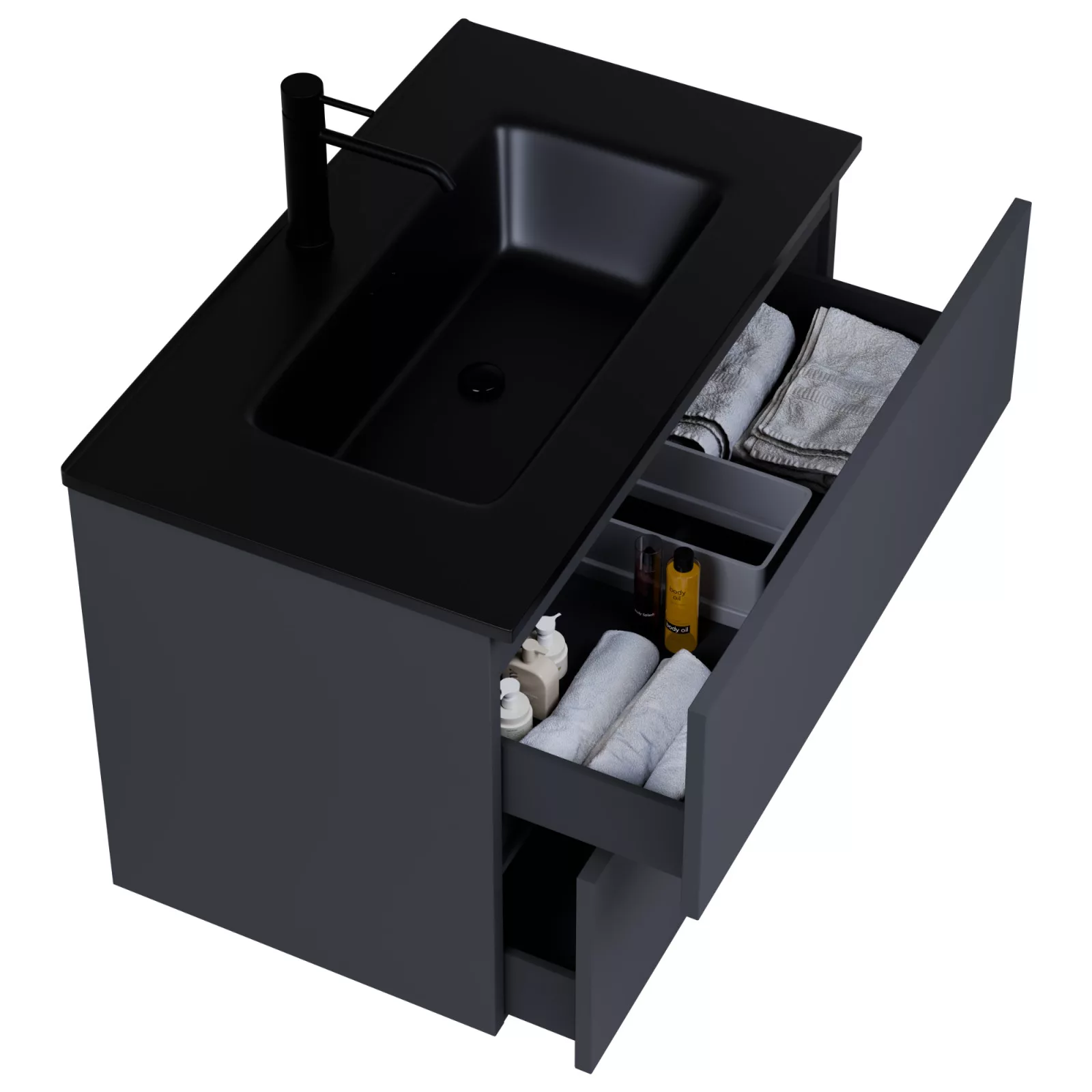 antracit mosdószekrény, teljes kihúzhatóságú fiókokkal