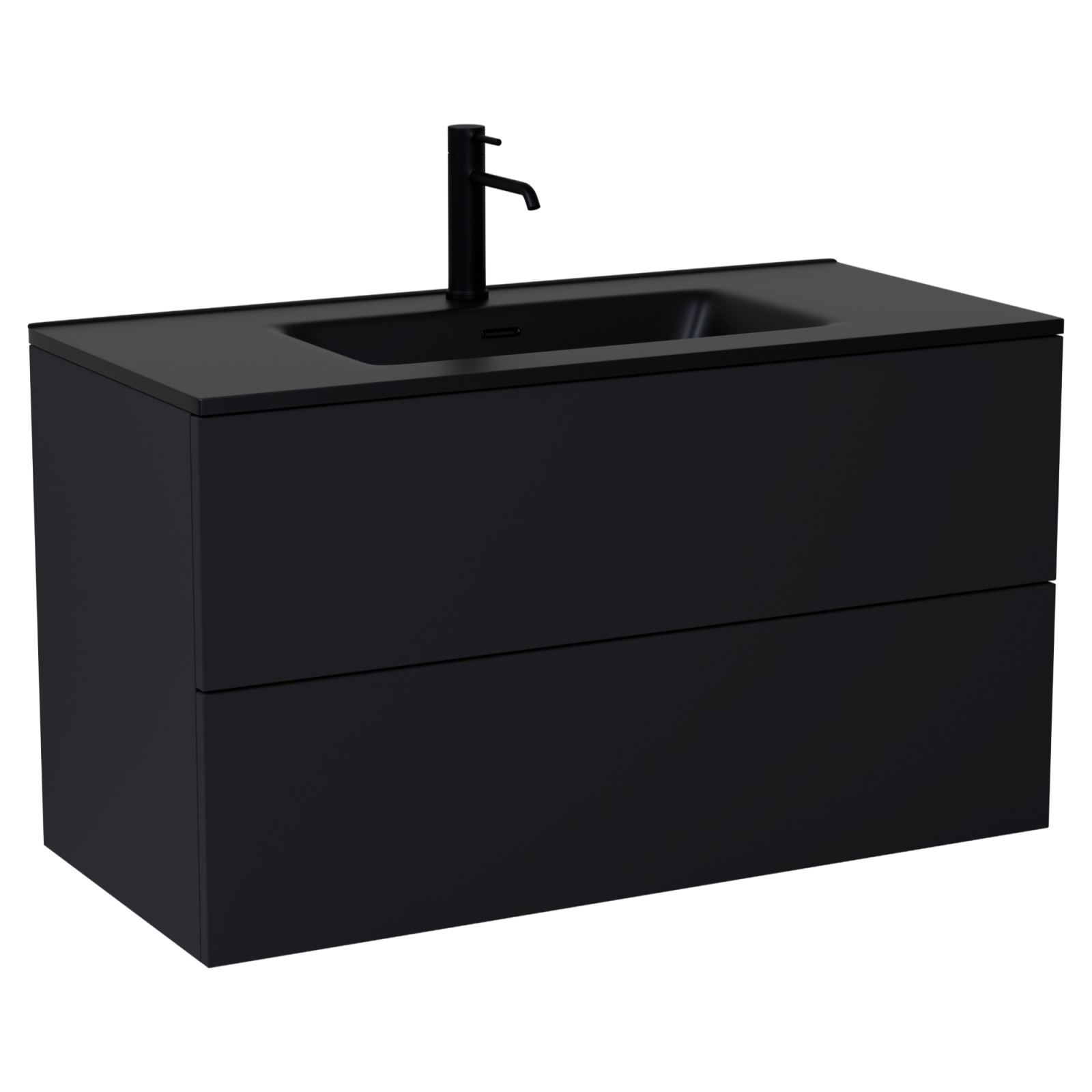 Saját márkás 100 cm széles fali mosdószekrény fekete színben fekete slim mosdóval, rejtett fióksínnel és önbehúzos technológiával ellátott. A fiókok modern push-to-open mechanizmussal nyílnak, amely mechanikus rugós rendszerrel biztosítja a fogantyú nélküli nyitást.