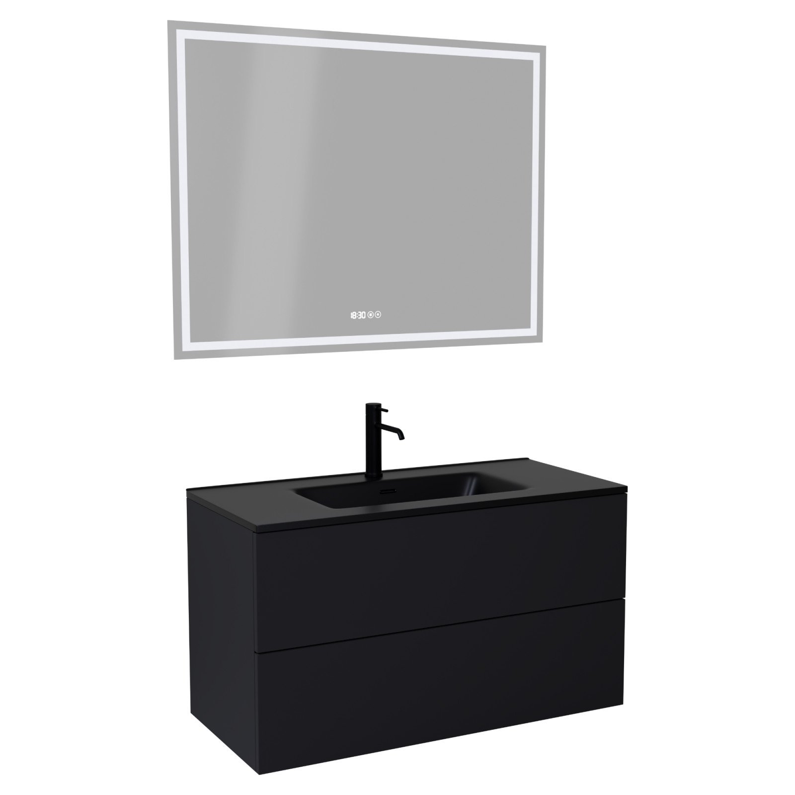 Saját márkás 100 cm széles komplett fürdőszoba bútor fali mosdószekrénnyel fekete színben, fekete slim mosdóval és fali okos LED tükörrel. A fiókok modern push-to-open mechanizmussal nyílnak, amely mechanikus rugós rendszerrel biztosítja a fogantyú nélküli nyitást.