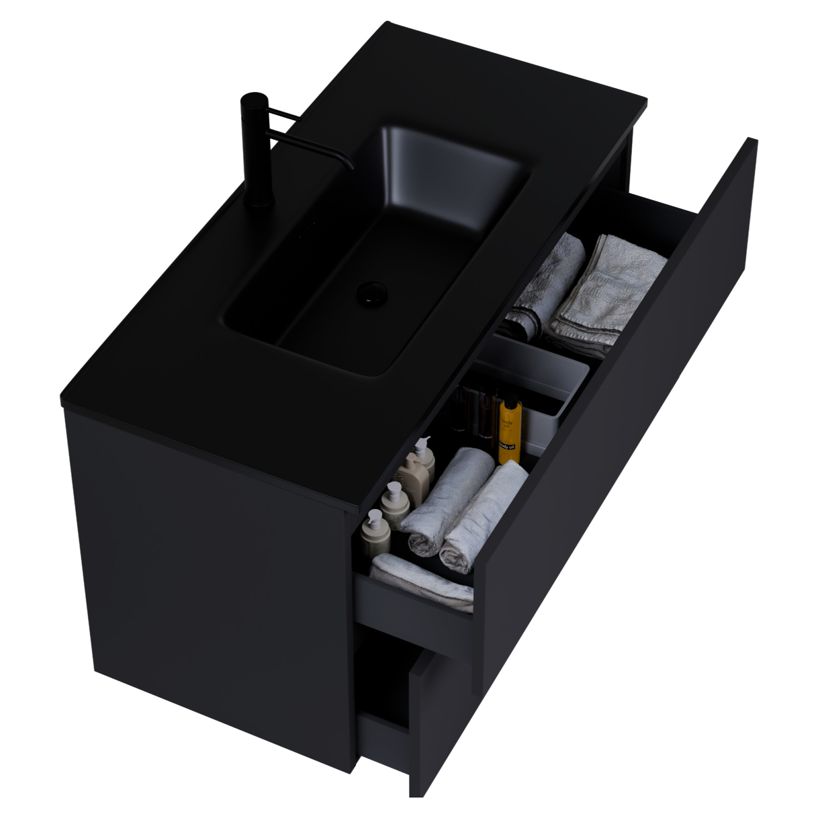 • fekete mosdószekrény, teljes kihúzhatóságú fiókokkal