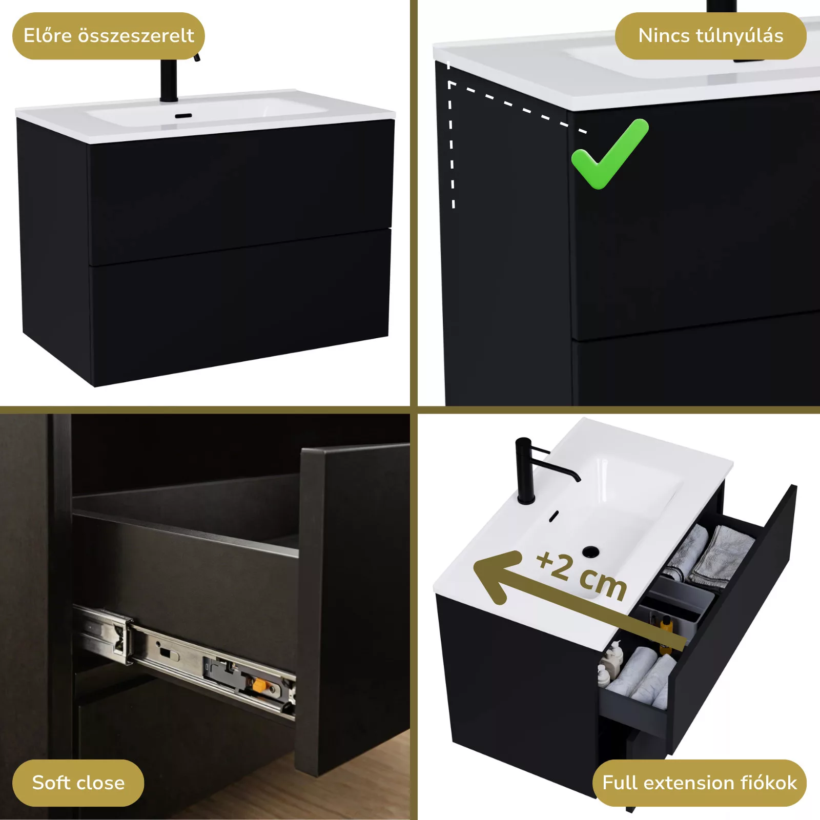 • fekete mosdószekrény, teljes kihúzhatóságú fiókokkal