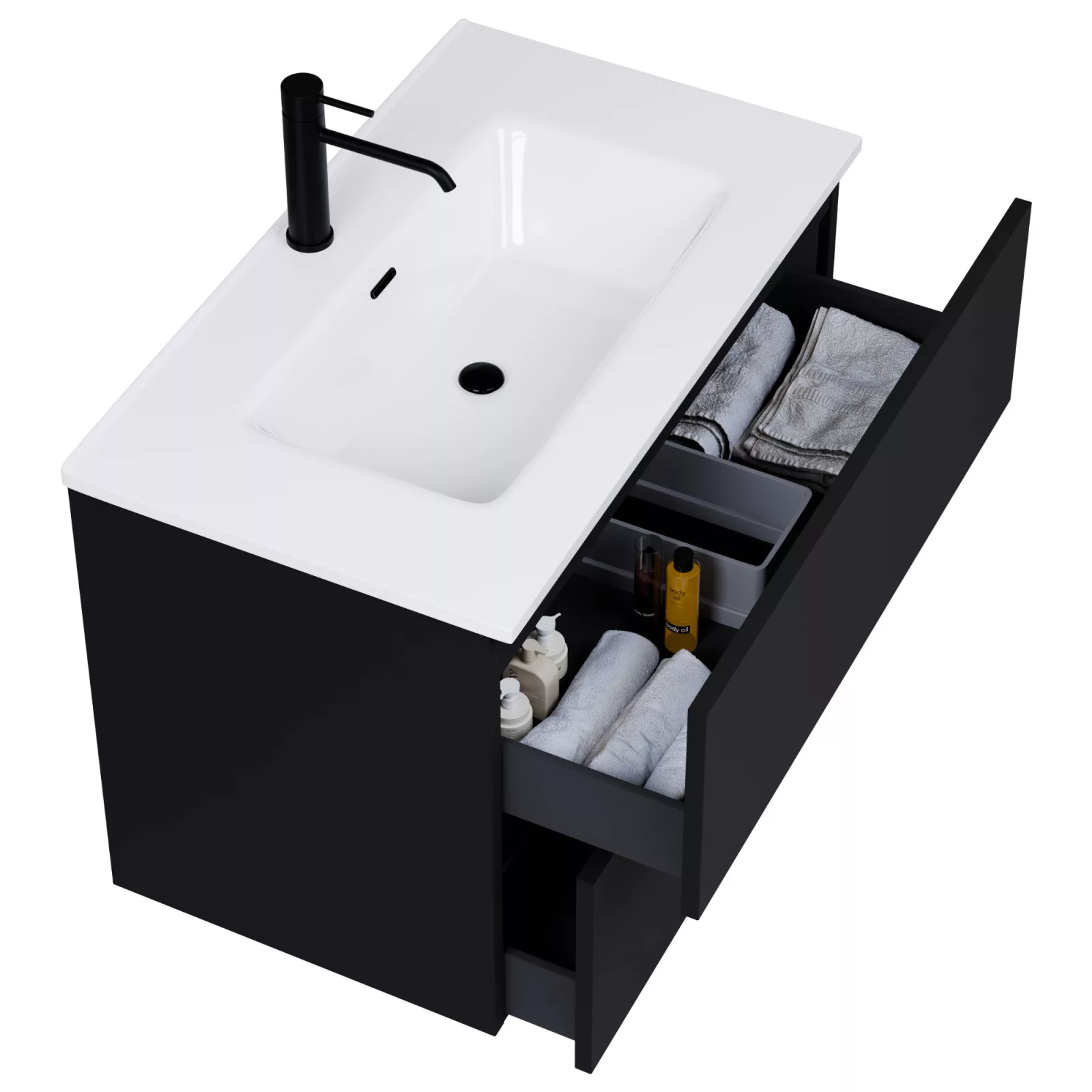 fekete mosdószekrény, teljes kihúzhatóságú fiókokkal
