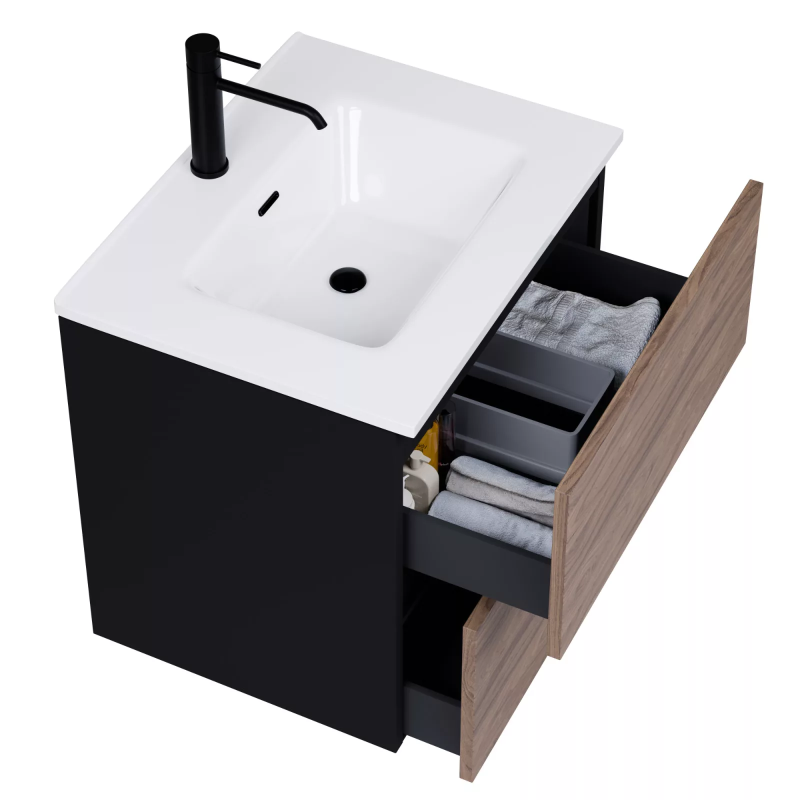 • fekete mosdószekrény, teljes kihúzhatóságú fiókokkal