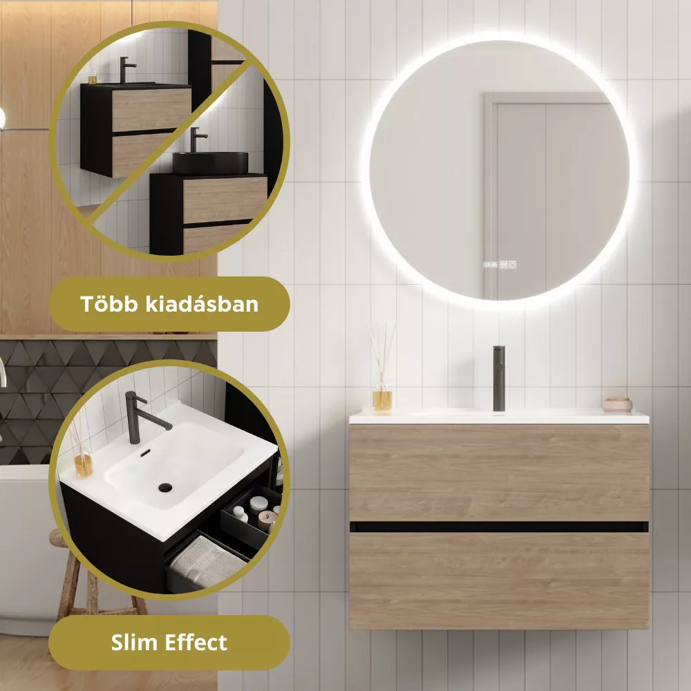 Saját márkás 80 cm széles komplett fürdőszoba bútor fali mosdószekrénnyel fekete színben, tölgyfa színű fiók fronttal, fényes fehér slim mosdóval és fali okos LED tükörrel. A fiókok modern push-to-open mechanizmussal nyílnak, amely mechanikus rugós rendszerrel biztosítja a fogantyú nélküli nyitást.