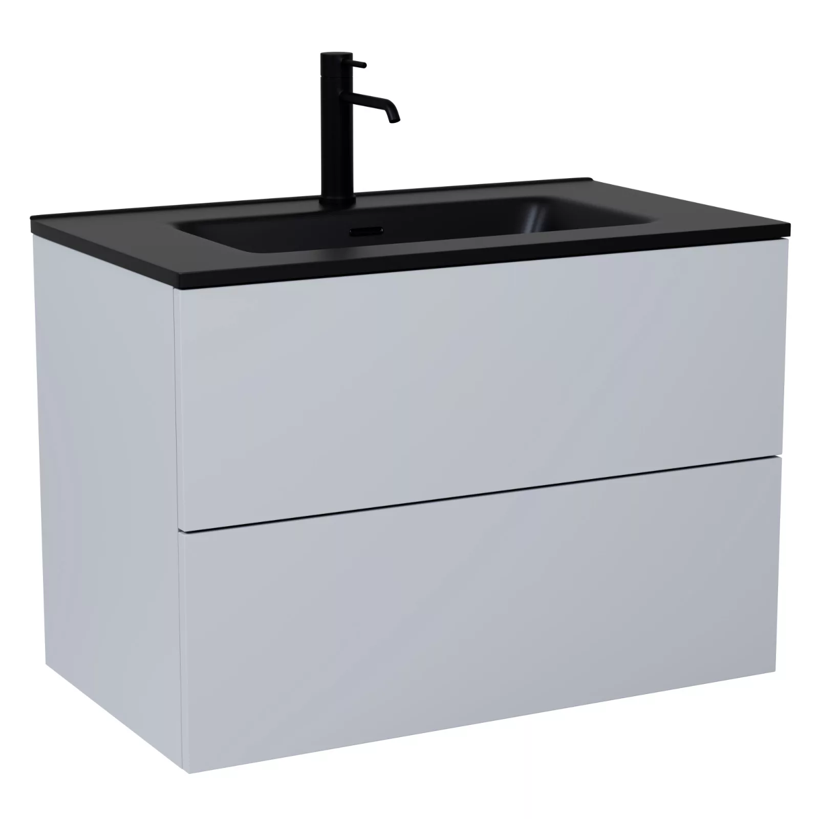 Saját márkás 60 cm széles fali mosdószekrény füst szürke színben fekete slim mosdóval, rejtett fióksínnel és önbehúzos technológiával ellátott. A fiókok modern push-to-open mechanizmussal nyílnak, amely mechanikus rugós rendszerrel biztosítja a fogantyú nélküli nyitást.
