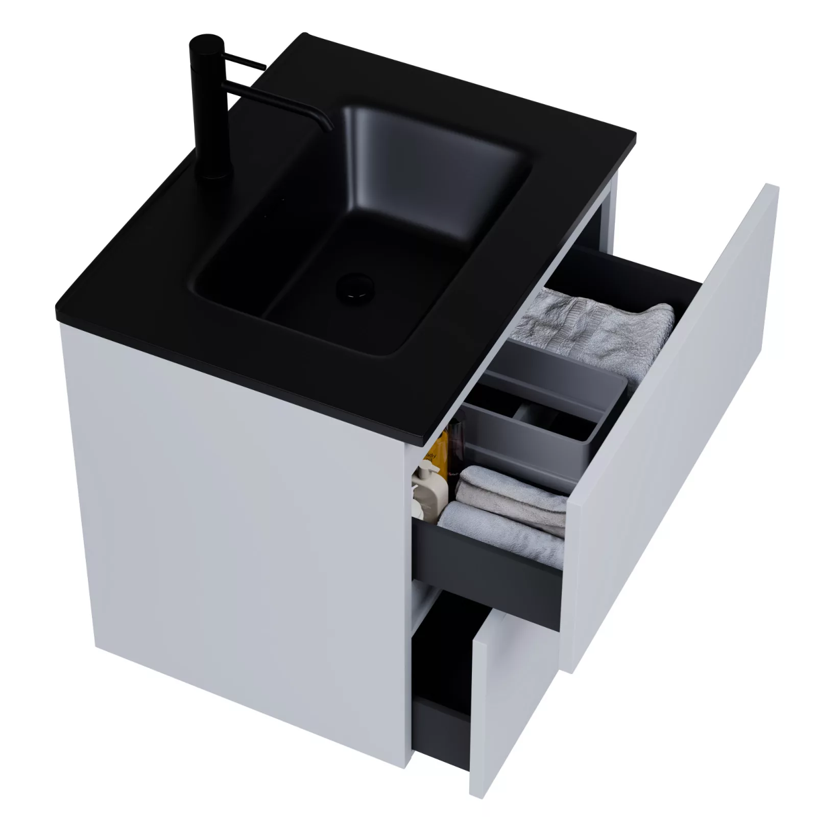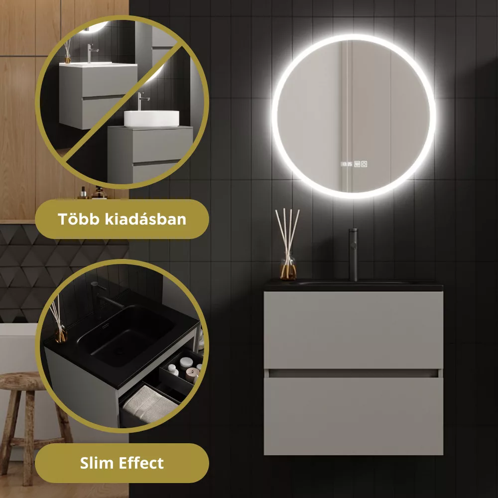 Saját márkás 60 cm széles komplett fürdőszoba bútor fali mosdószekrénnyel füst szürke színben, fekete slim mosdóval és fali okos LED tükörrel. A fiókok modern push-to-open mechanizmussal nyílnak, amely mechanikus rugós rendszerrel biztosítja a fogantyú nélküli nyitást.