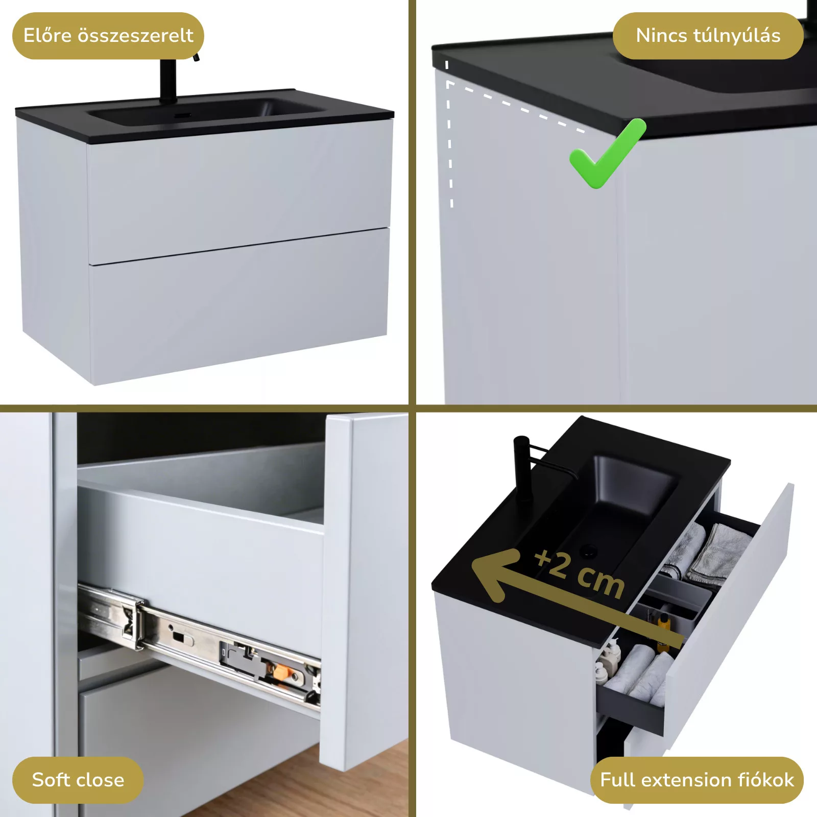 • füst szürke mosdószekrény, teljes kihúzhatóságú fiókokkal