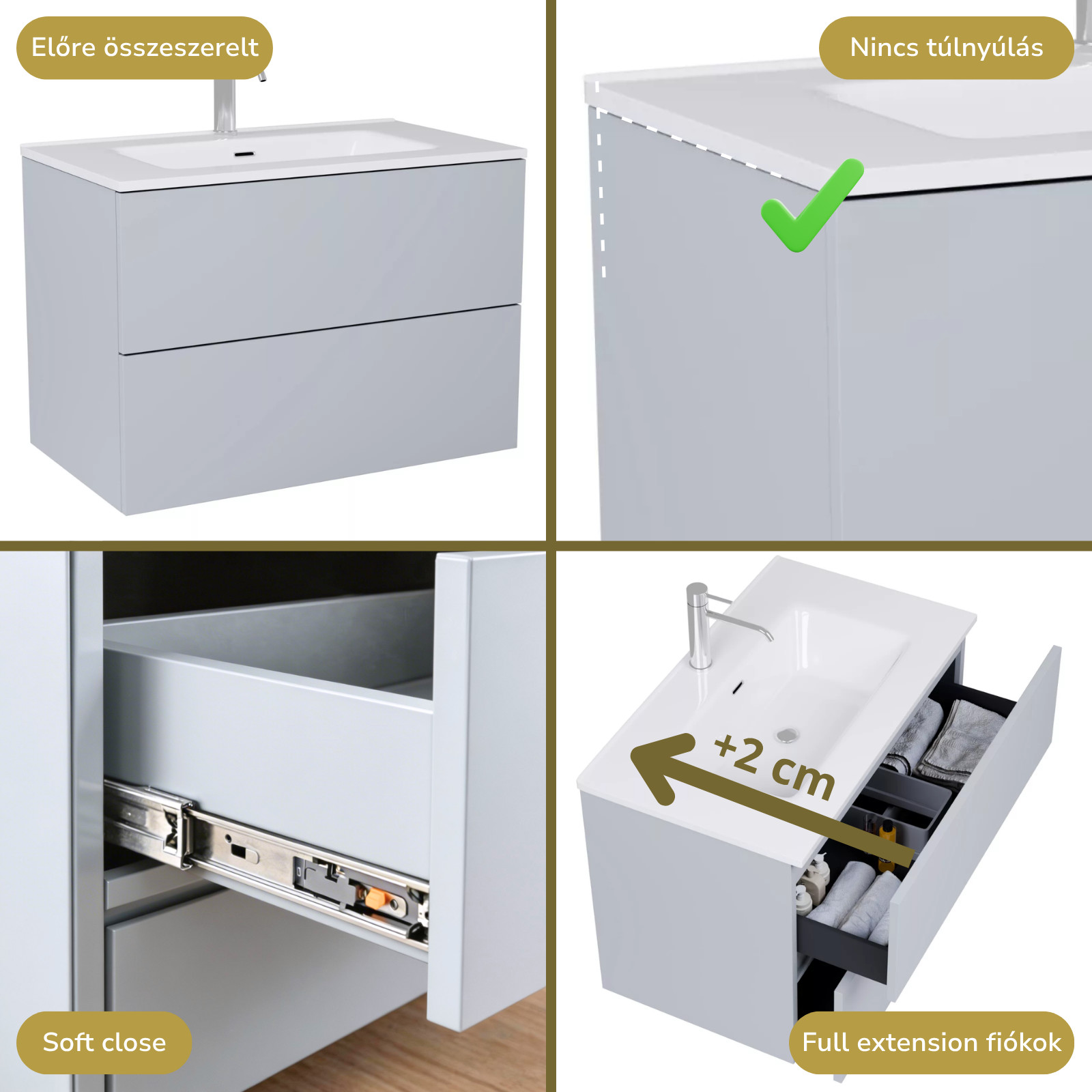 füst szürke mosdószekrény, teljes kihúzhatóságú fiókokkal