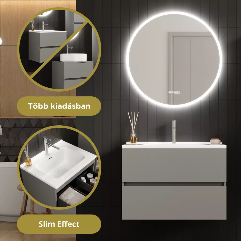 Saját márkás 80 cm széles komplett fürdőszoba bútor fali mosdószekrénnyel füst szürke színben, fényes fehér slim mosdóval és fali okos LED tükörrel. A fiókok modern push-to-open mechanizmussal nyílnak, amely mechanikus rugós rendszerrel biztosítja a fogantyú nélküli nyitást.