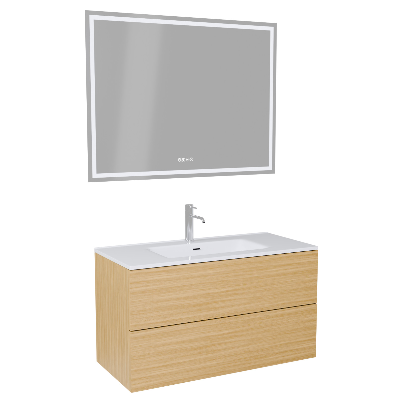 Saját márkás 100 cm széles komplett fürdőszoba bútor fali mosdószekrénnyel hikoridió színben, fényes fehér slim mosdóval és fali okos LED tükörrel. A fiókok modern push-to-open mechanizmussal nyílnak, amely mechanikus rugós rendszerrel biztosítja a fogantyú nélküli nyitást.