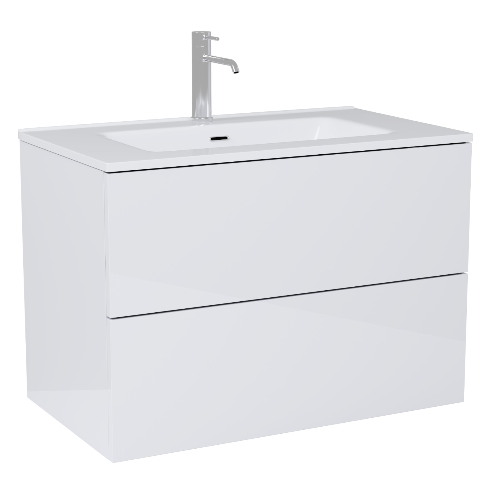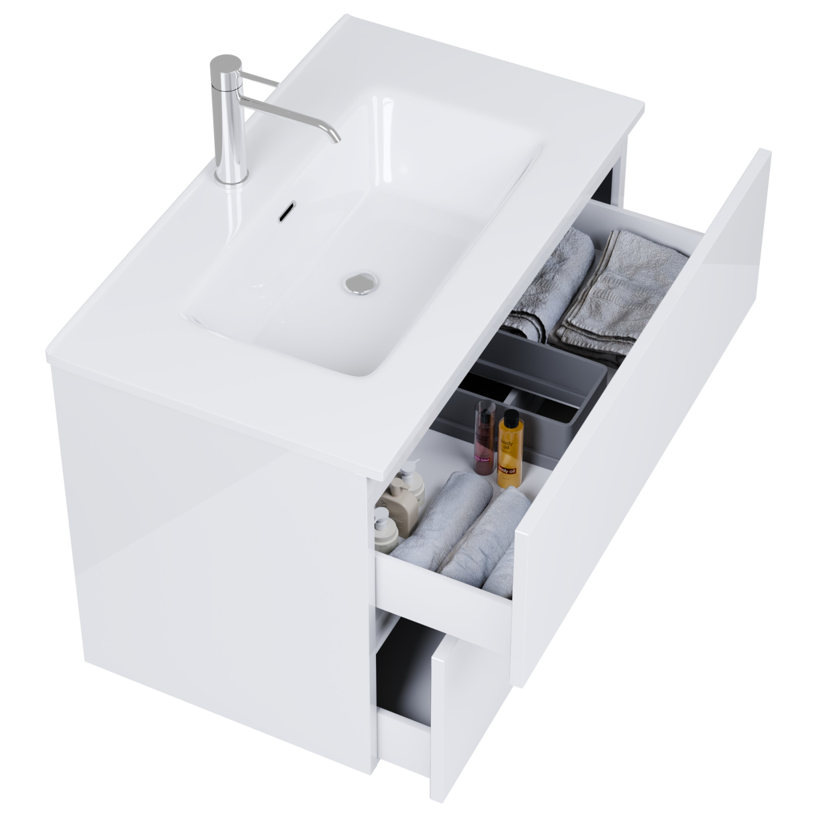 • fényes fehér mosdószekrény, teljes kihúzhatóságú fiókokkal