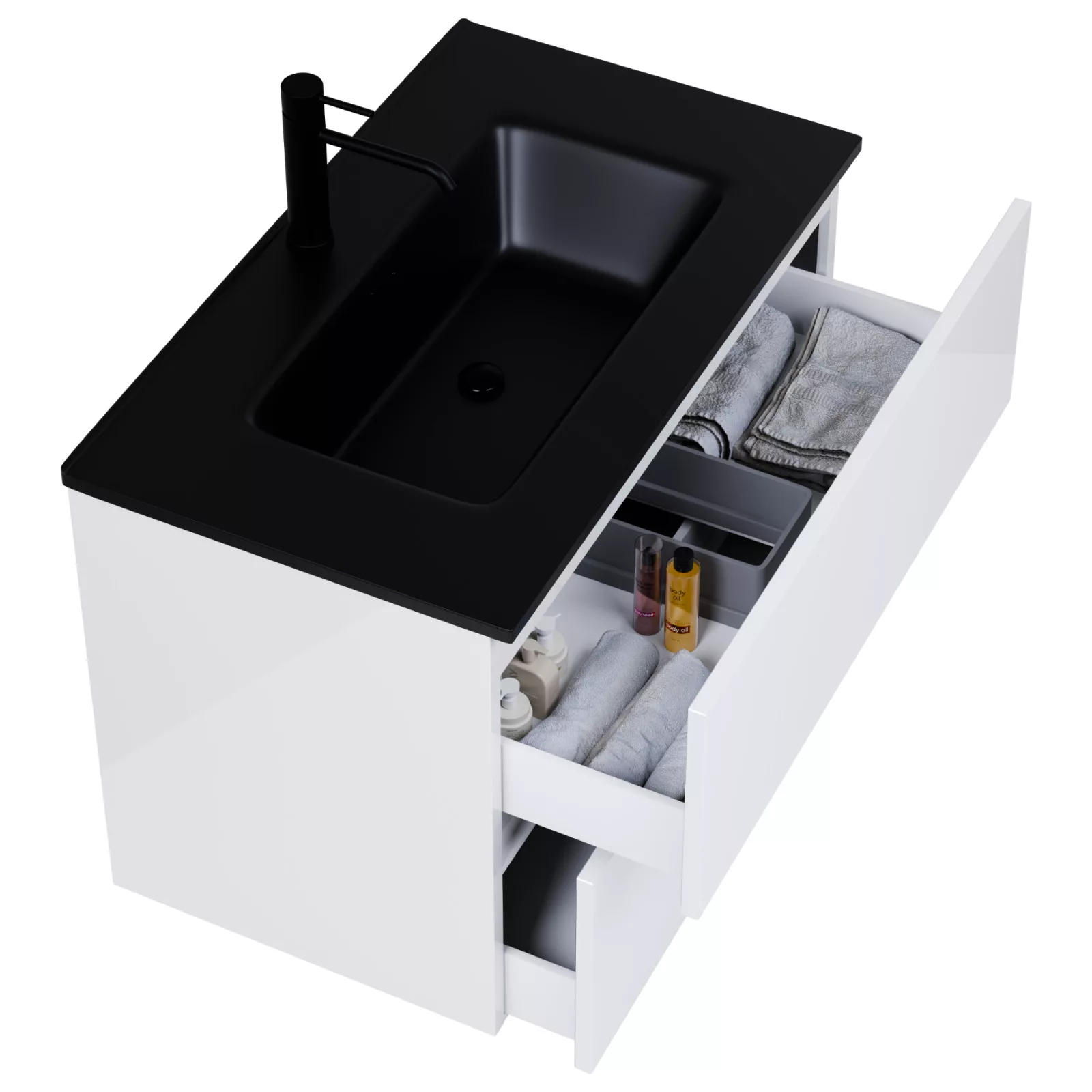 fényes fehér mosdószekrény, teljes kihúzhatóságú fiókokkal