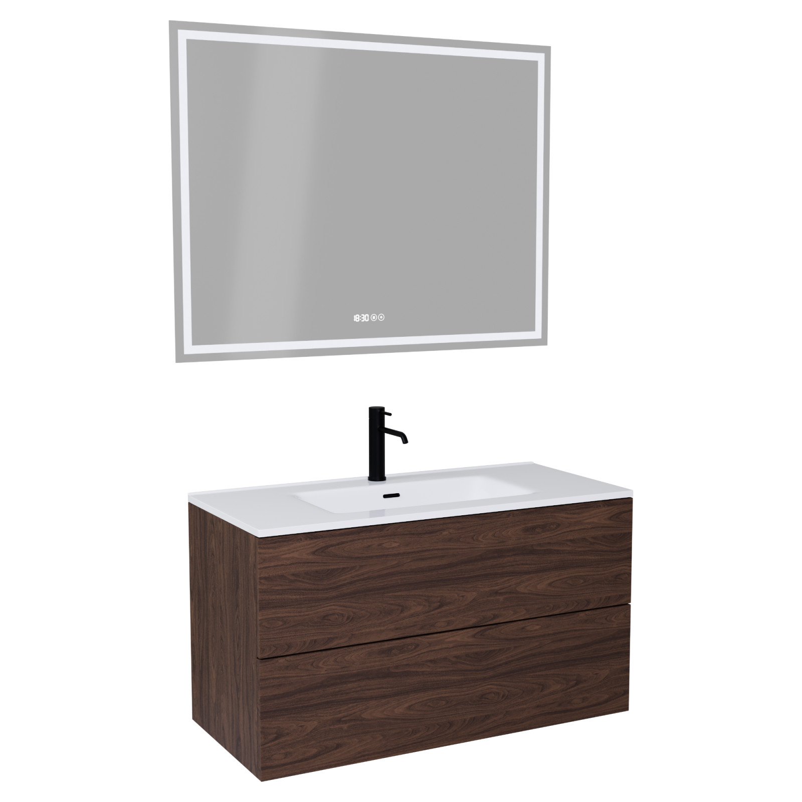 Saját márkás 100 cm széles komplett fürdőszoba bútor fali mosdószekrénnyel mogyoró színben, fényes fehér slim mosdóval és fali okos LED tükörrel. A fiókok modern push-to-open mechanizmussal nyílnak, amely mechanikus rugós rendszerrel biztosítja a fogantyú nélküli nyitást.