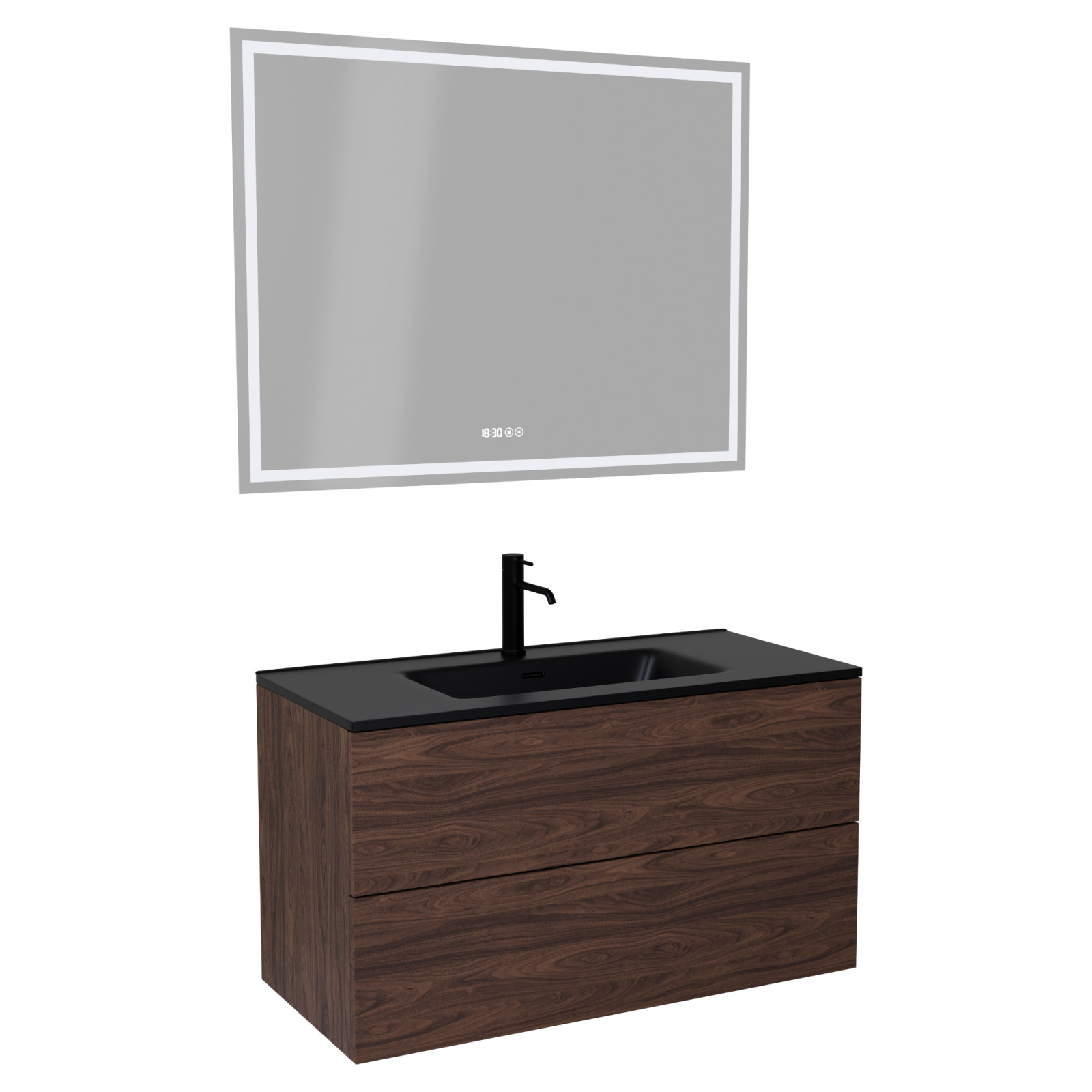 Saját márkás 100 cm széles komplett fürdőszoba bútor fali mosdószekrénnyel mogyoró színben, fekete slim mosdóval és fali okos LED tükörrel. A fiókok modern push-to-open mechanizmussal nyílnak, amely mechanikus rugós rendszerrel biztosítja a fogantyú nélküli nyitást.