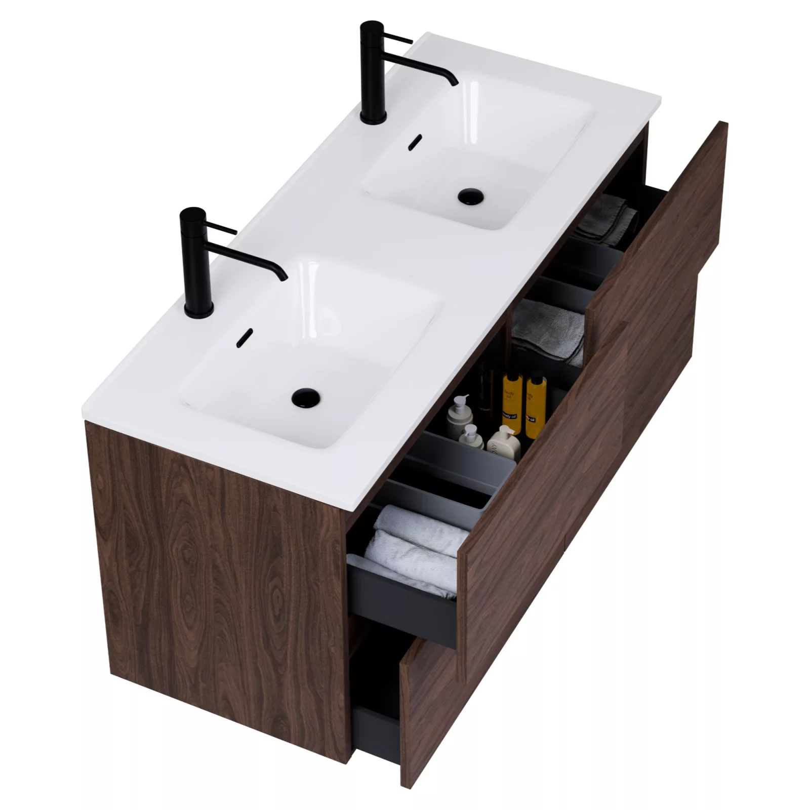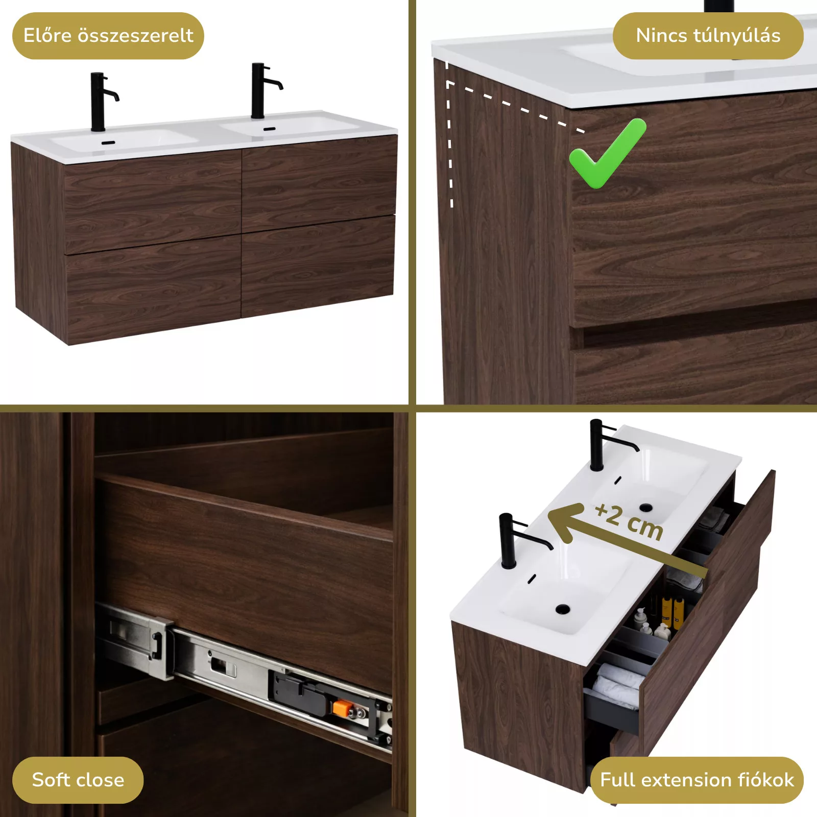 Saját márkás 120 cm széles fali mosdószekrény mogyoró színben, rejtett fióksínnel és önbehúzos technológiával ellátott. A fiókok modern push-to-open mechanizmussal nyílnak, amely mechanikus rugós rendszerrel biztosítja a fogantyú nélküli nyitást.