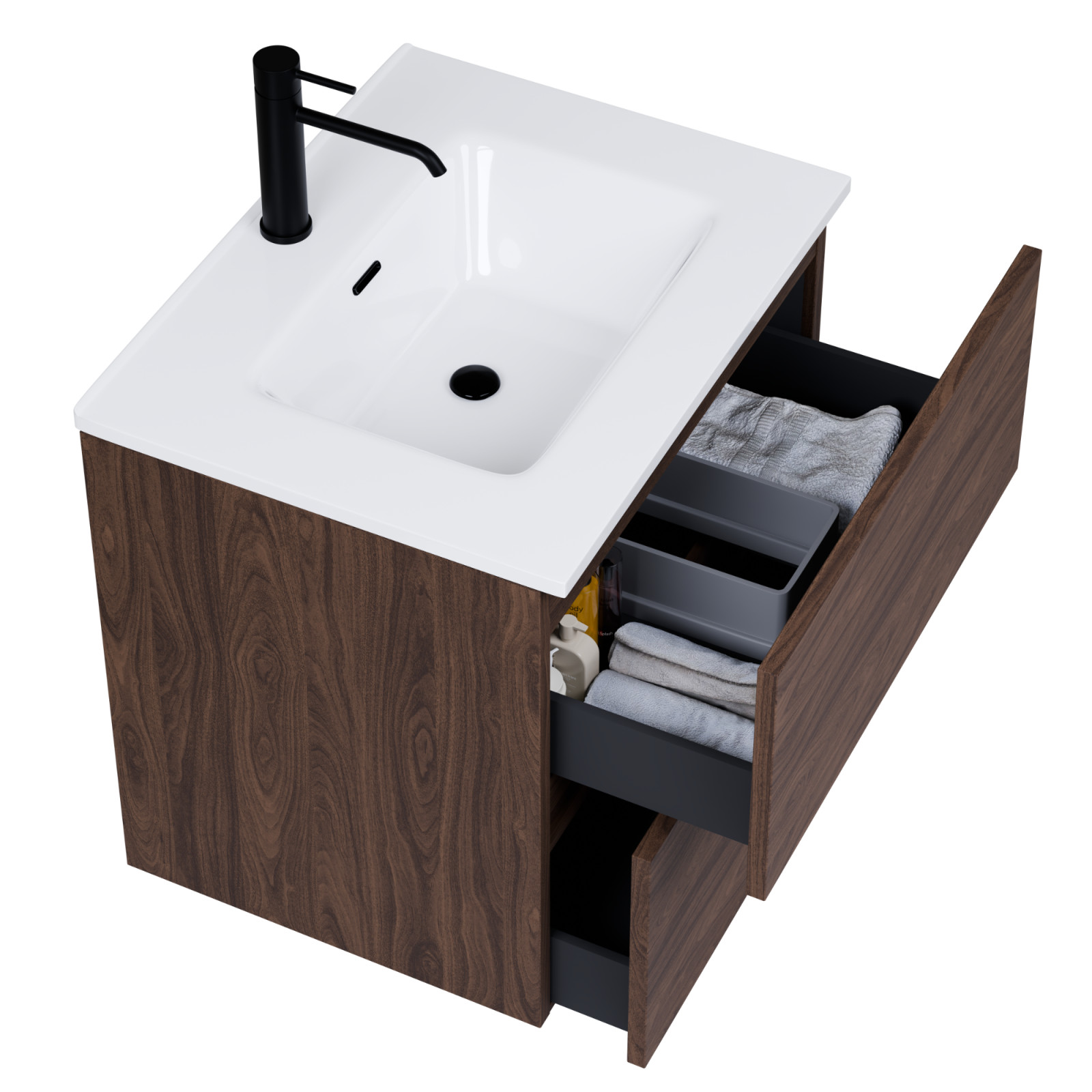 Saját márkás 60 cm széles komplett fürdőszoba bútor fali mosdószekrénnyel mogyoró színben és fali okos LED tükörrel. A fiókok modern push-to-open mechanizmussal nyílnak, amely mechanikus rugós rendszerrel biztosítja a fogantyú nélküli nyitást.