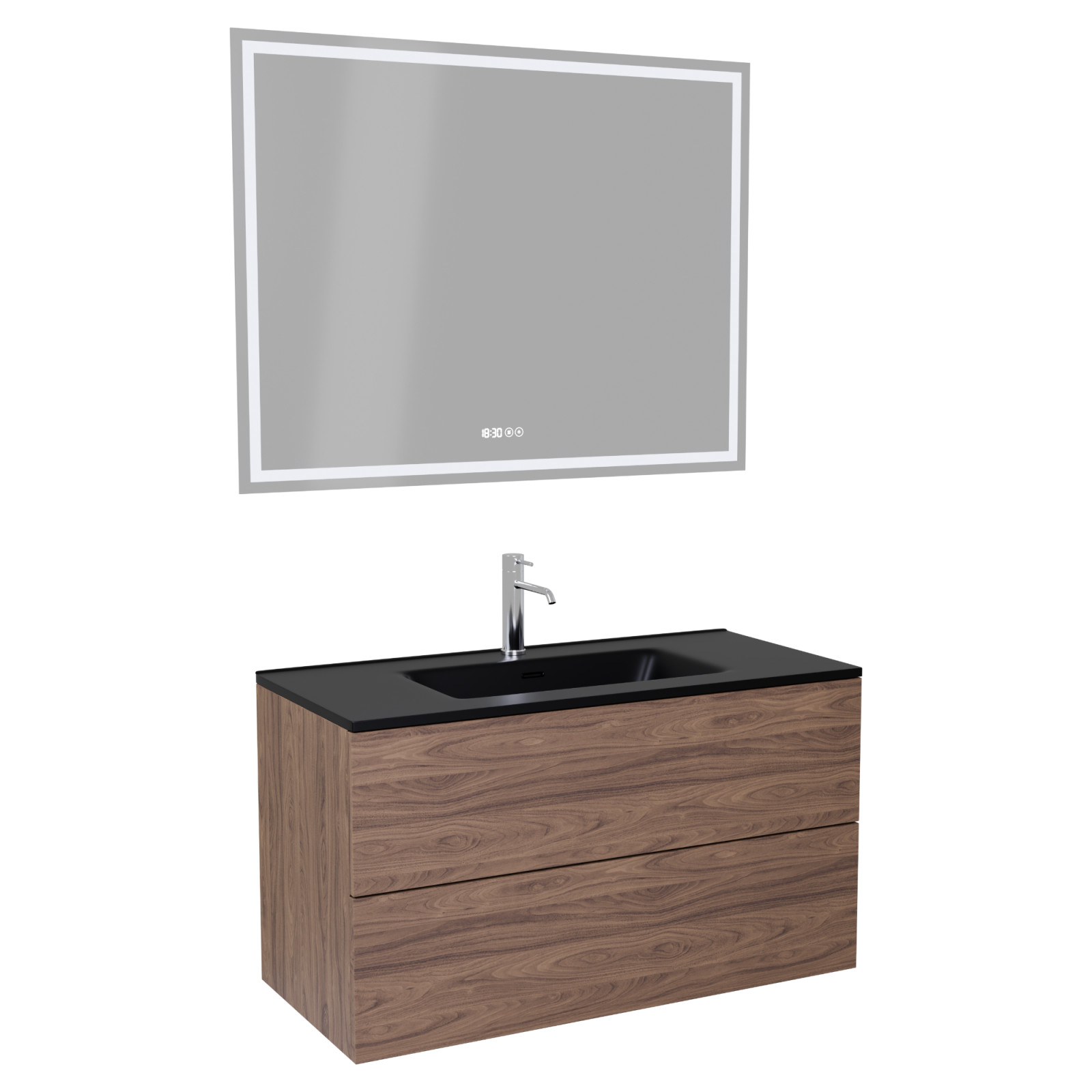 Saját márkás 100 cm széles komplett fürdőszoba bútor fali mosdószekrénnyel tölgyfa színben, fekete slim mosdóval és fali okos LED tükörrel. A fiókok modern push-to-open mechanizmussal nyílnak, amely mechanikus rugós rendszerrel biztosítja a fogantyú nélküli nyitást.