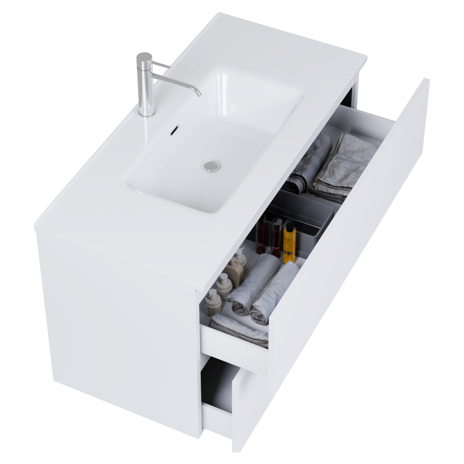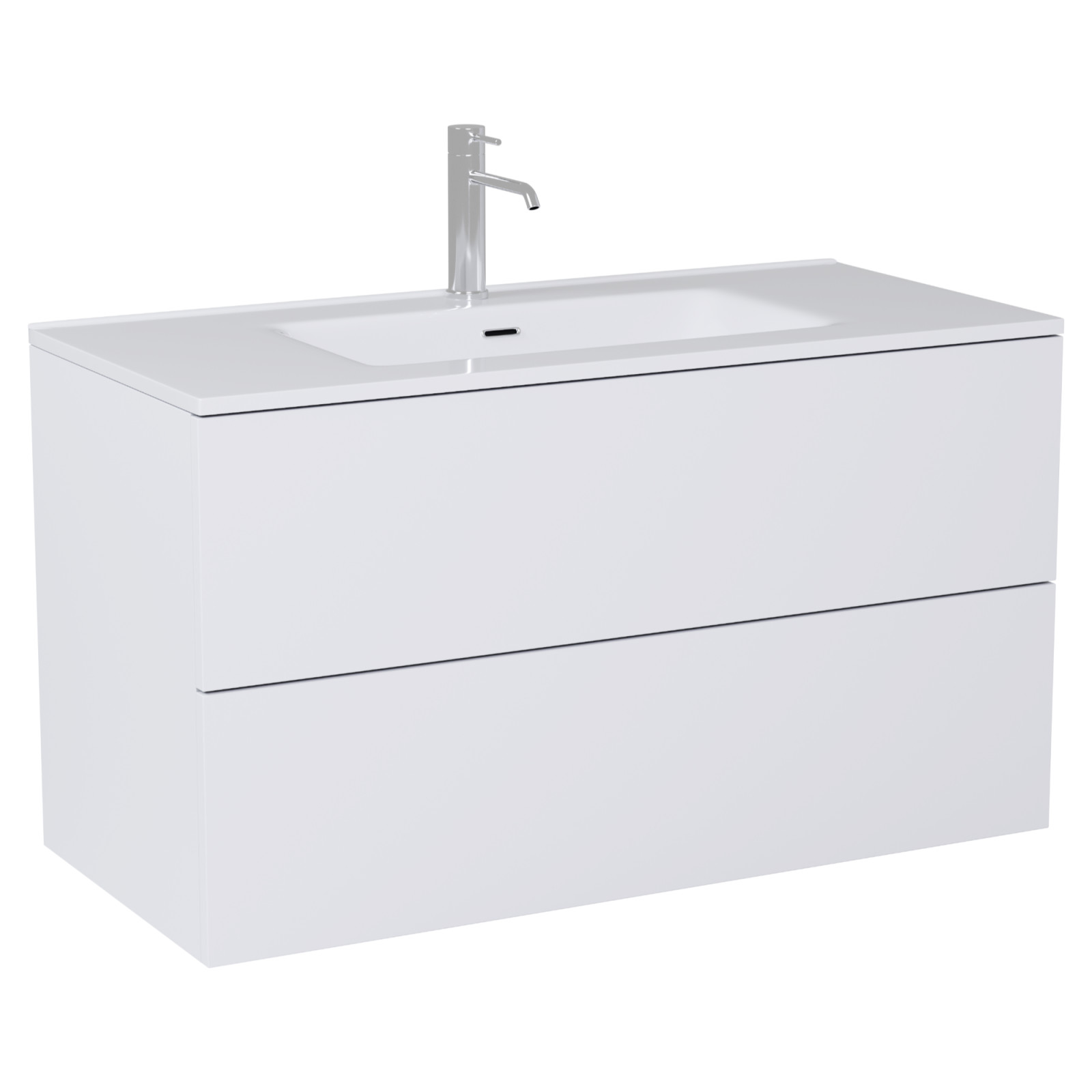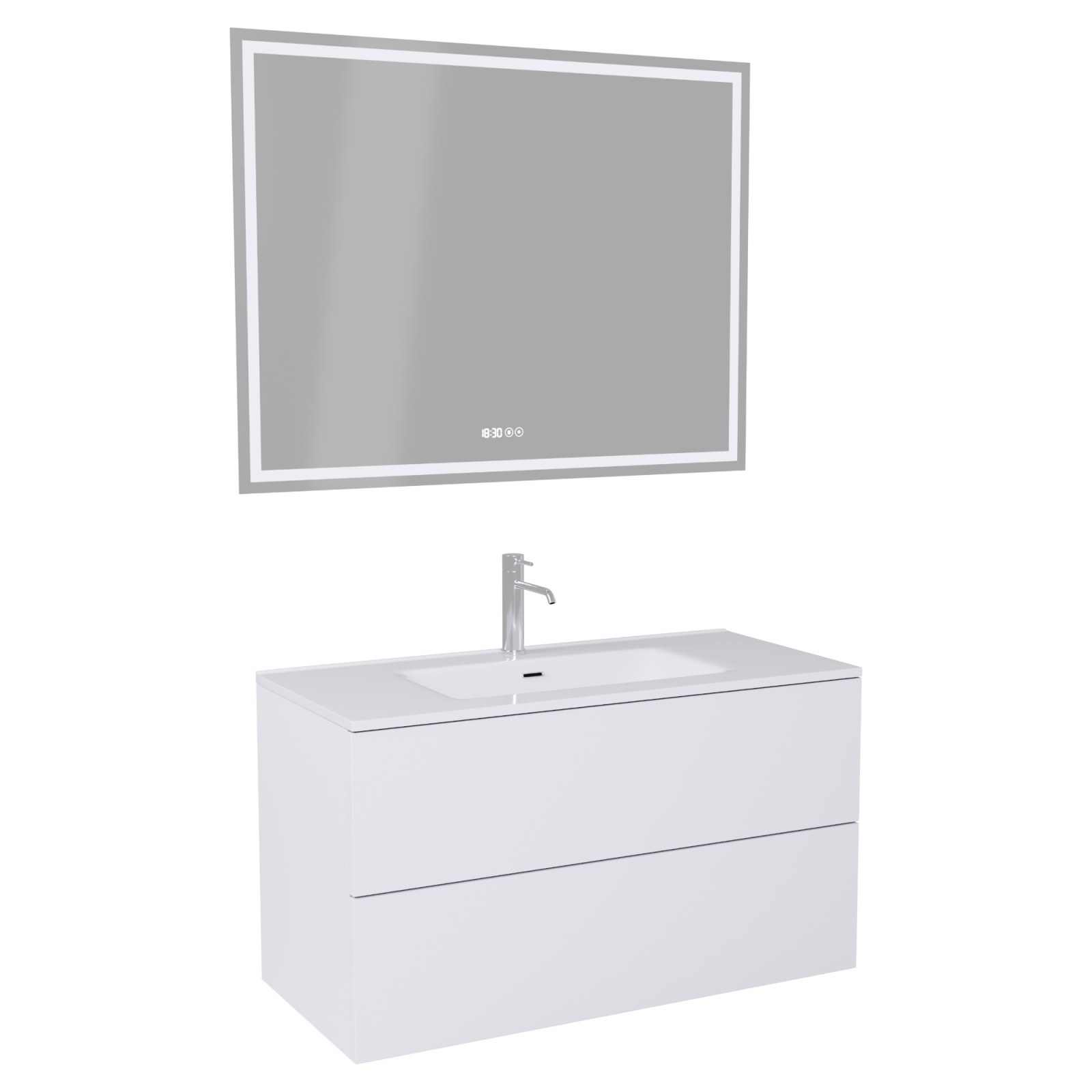 Saját márkás 100 cm széles komplett fürdőszoba bútor fali mosdószekrénnyel fehér színben, fényes fehér slim mosdóval és fali okos LED tükörrel. A fiókok modern push-to-open mechanizmussal nyílnak, amely mechanikus rugós rendszerrel biztosítja a fogantyú nélküli nyitást.