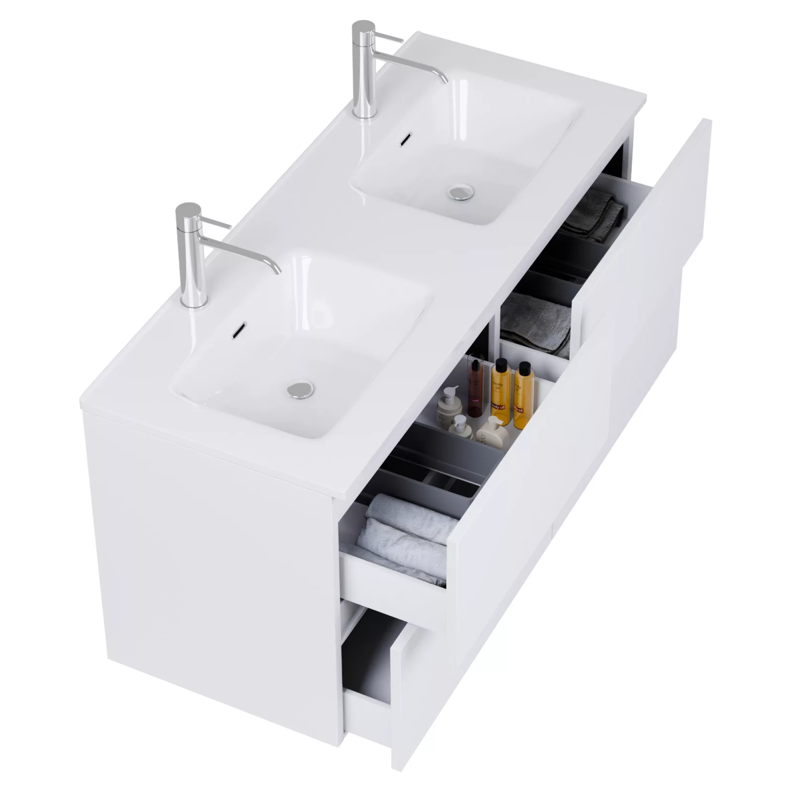 Saját márkás 120 cm széles fali mosdószekrény fehér színben, rejtett fióksínnel és önbehúzos technológiával ellátott. A fiókok modern push-to-open mechanizmussal nyílnak, amely mechanikus rugós rendszerrel biztosítja a fogantyú nélküli nyitást.