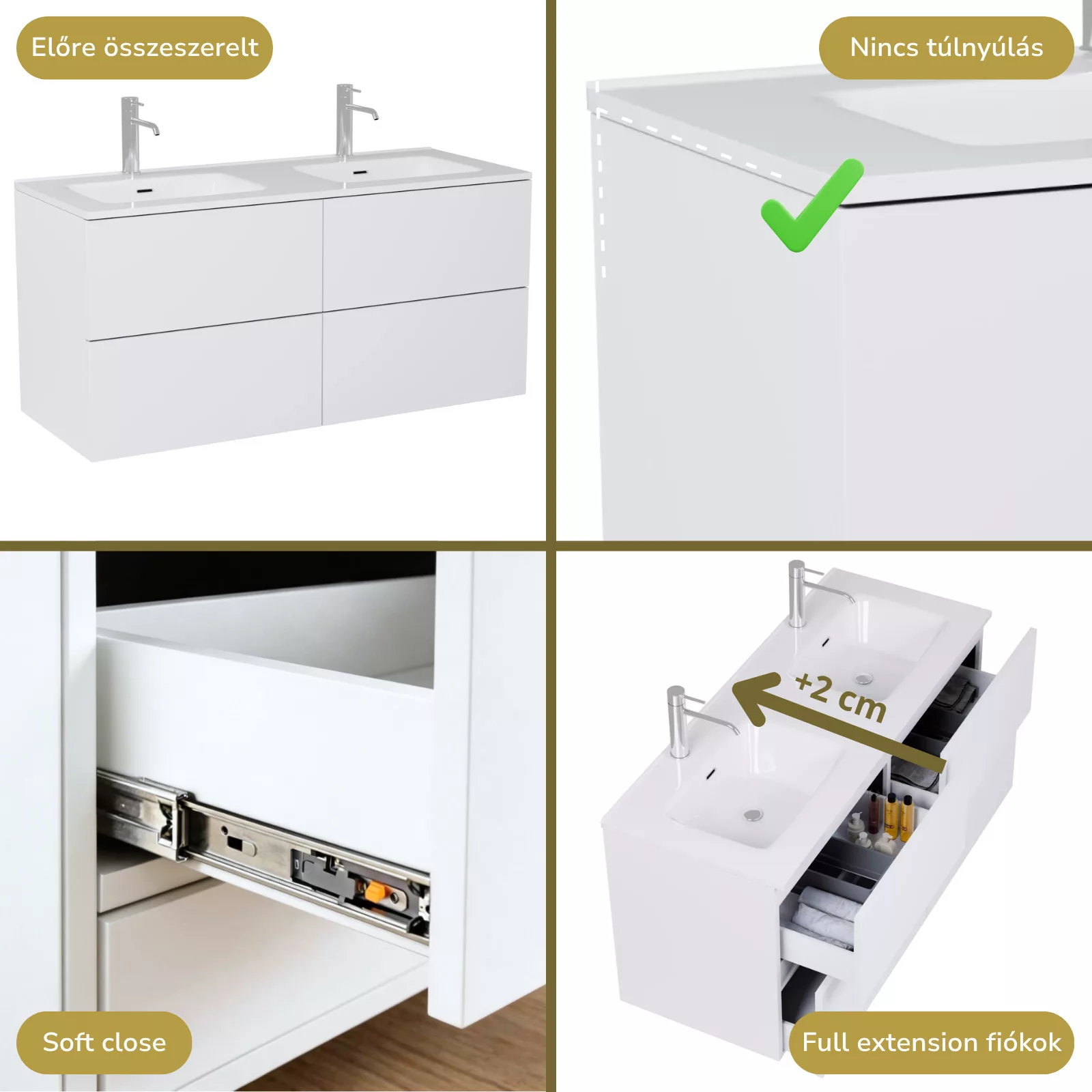 • selymes matt fehér mosdószekrény, teljes kihúzhatóságú fiókokkal