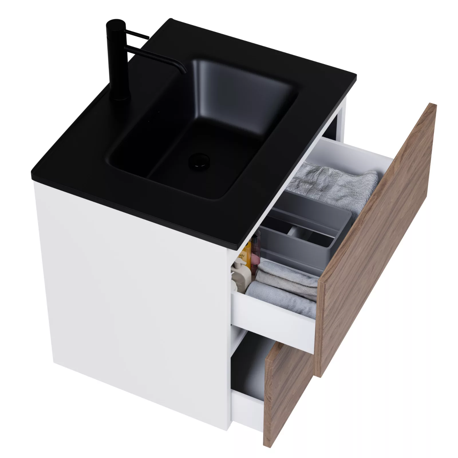 Saját márkás 60 cm széles komplett fürdőszoba bútor fali mosdószekrénnyel fehér színben, tölgyfa színű fiók fronttal, fekete slim mosdóval és fali okos LED tükörrel. A fiókok modern push-to-open mechanizmussal nyílnak, amely mechanikus rugós rendszerrel biztosítja a fogantyú nélküli nyitást.