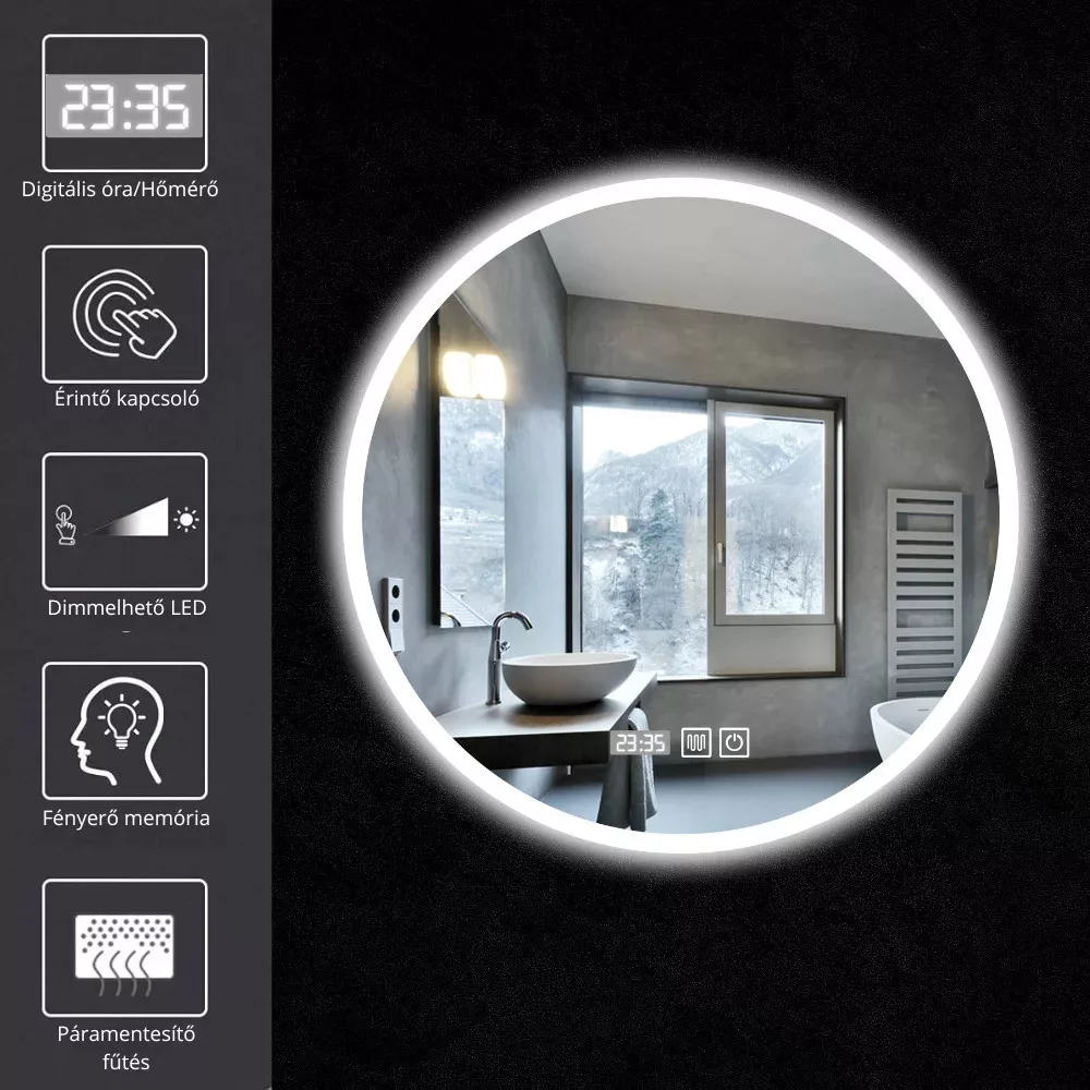Ambient világítás, érintés kapcsoló, digitális óra, páramentesítő fűtés, integrált LED világítás