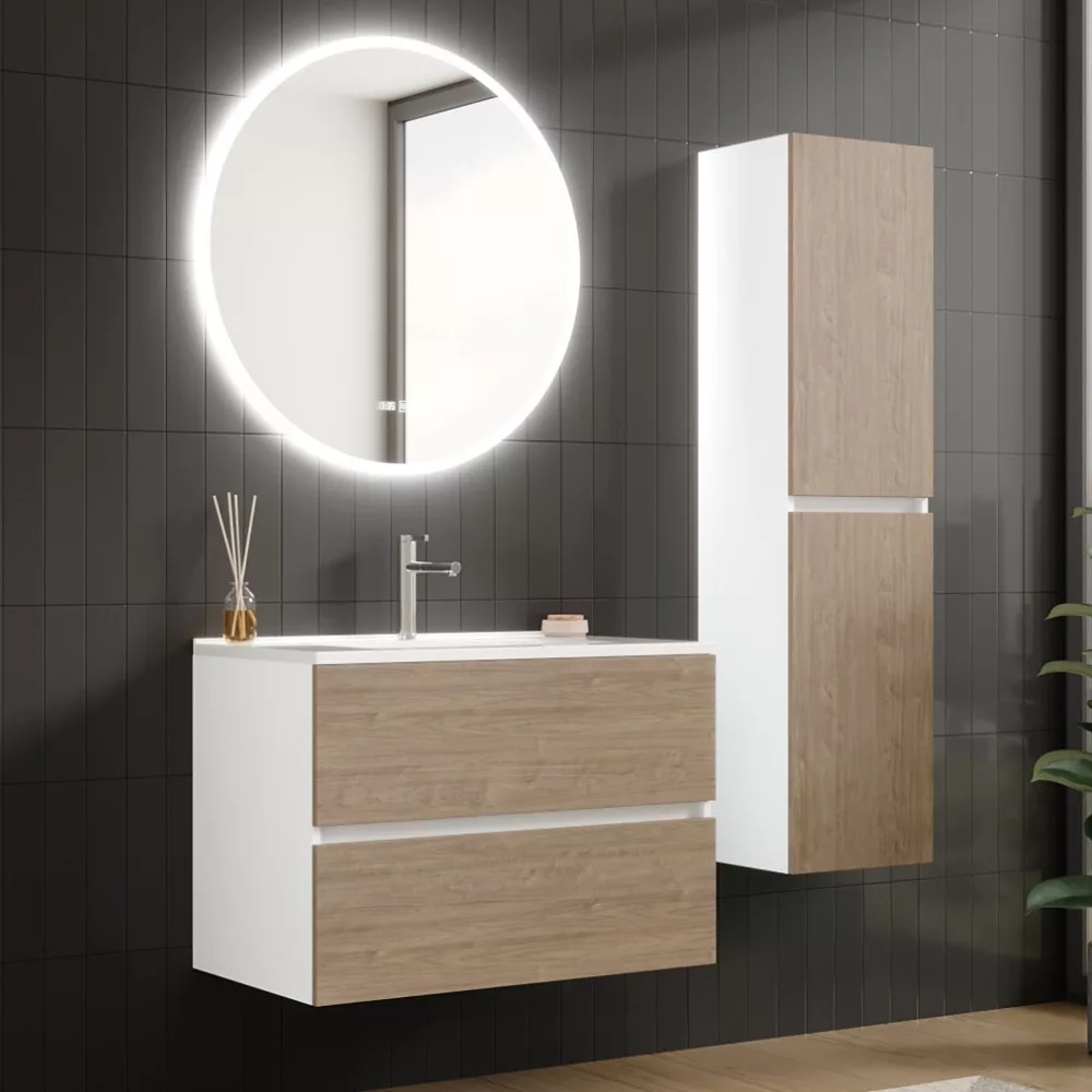 Saját márkás 80 cm széles komplett fürdőszoba bútor fali mosdószekrénnyel fehér színben, tölgyfa színű fiók fronttal, fényes fehér slim mosdóval és fali okos LED tükörrel.