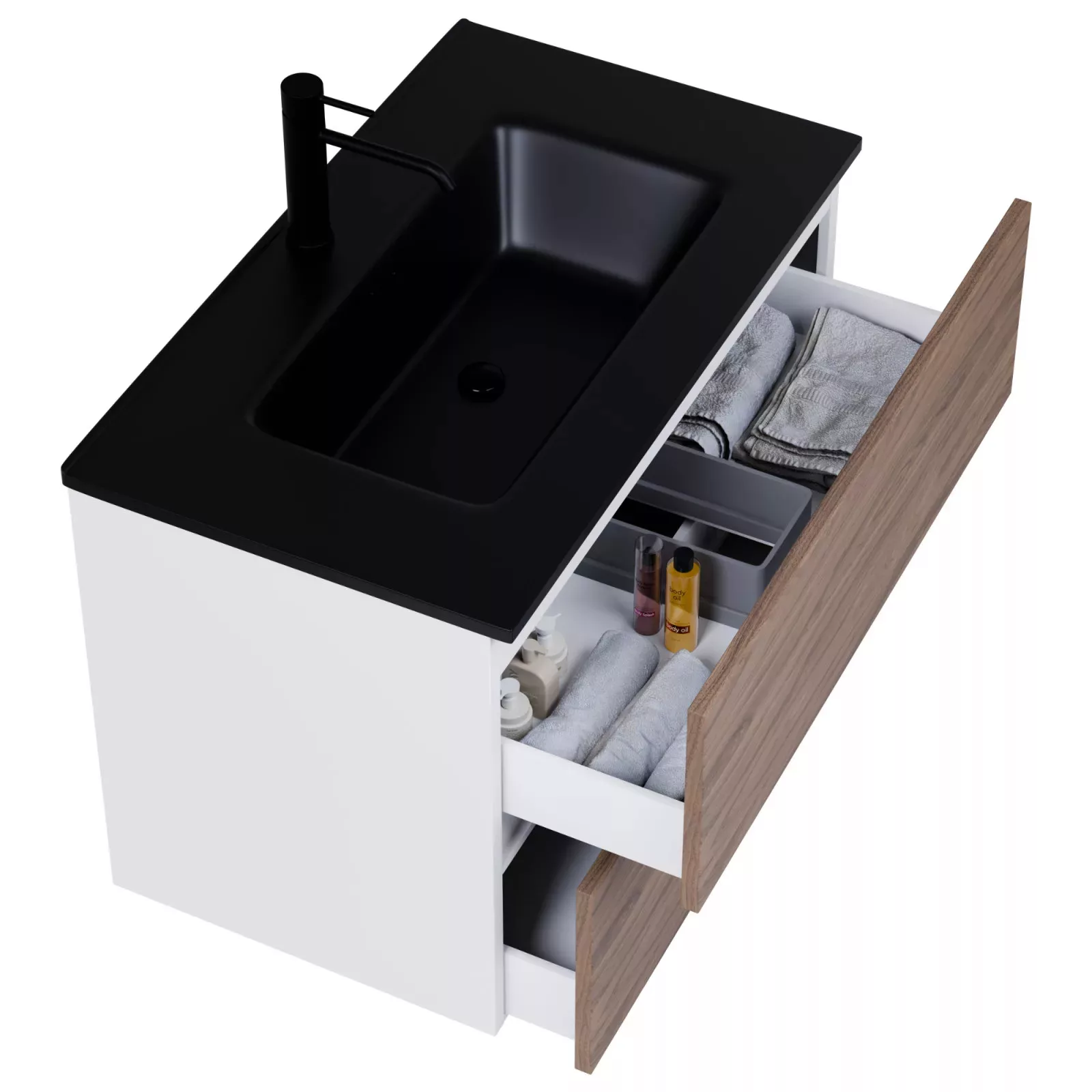 Napjainkban a praktikum mellett a fürdőszoba esztétikus megjelenése is fontos szempont. A függesztett bútorok egyre elterjedtebbé válnak, mivel számos előnnyel rendelkeznek, ide sorolható a modern, könnyed megjelenés és az egyszerű tisztítás . A függesztett fürdőszobai bútorok a klasszikus és modernebb stílusú fürdőszobákban is megállják a helyüket egyaránt. Nagyfokú rugalmasság jellemzi őket, mivel szinte bárhol elhelyezhetők a fürdőszobán belül. További előnyük, hogy soft close (csillapítós) zsanérral felszereltek, így becsukáskor az ajtó vagy fiók finoman záródik be, csökkentve a terhelést és növelve az élettartamot . A szekrény fehér és matt fekete mosdóval, illetve mosdópulttal is szabadon kombinálható ízlés szerint. A teljesség érdekében a mosdószekrényekhez illő LED okostükröt és magasszekrényt is választhatunk, hogy a fürdőszobában lévő bútorok egy szemet gyönyörködtető egységet alkossanak.